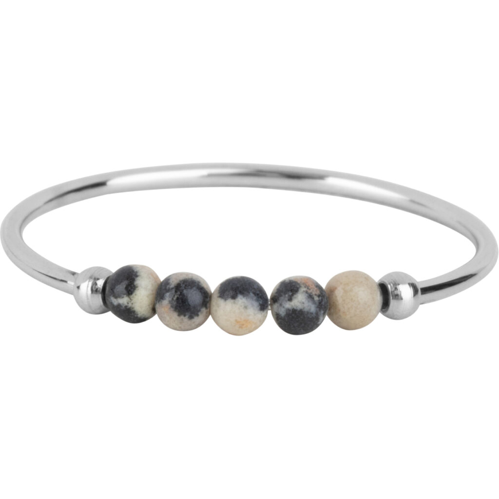 Stalen Fidget ring “Charmin’s Anxiety Ring Dalmation Jaspis Edelsteen Kraaltjes Steel Palm R1316”. Ring van 1mm versierd met 5 draaiende kraaltjes van edelsteen.