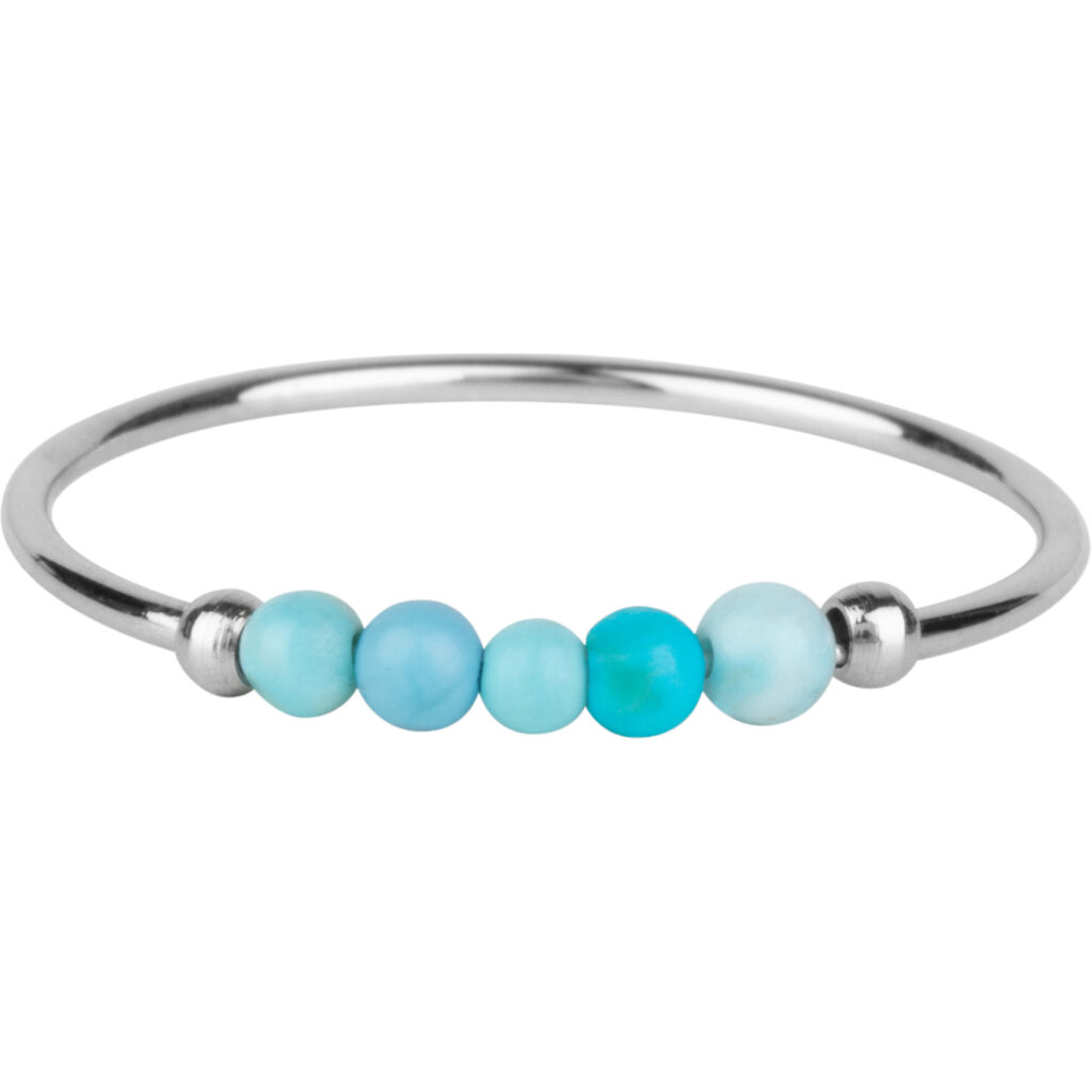 Stalen Fidget ring “Charmin’s Anxiety Ring NaturalStones Turquoise Beads Staal Palm R1310” van het fashion sieradenmerk Charmin’s. Ring van 1mm versierd met 5 draaiende halfedelstenen kraaltjes.