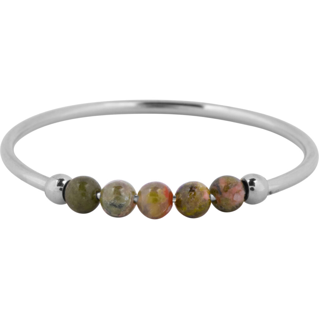 Stalen Fidget ring “Charmin’s Anxiety Ring NaturalStones Crystal Beads Steel R1318” van het fashion sieradenmerk Charmin’s. Ring van 1mm versierd met 5 draaiende halfedelstenen kraaltjes.
