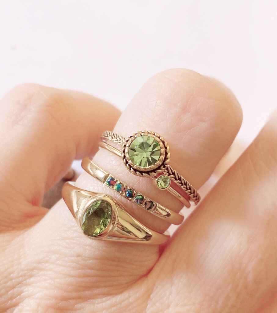 De edelstenen die horen bij de geboortes in augustus zijn de peridot, Hier passen de kleuren groen bij.