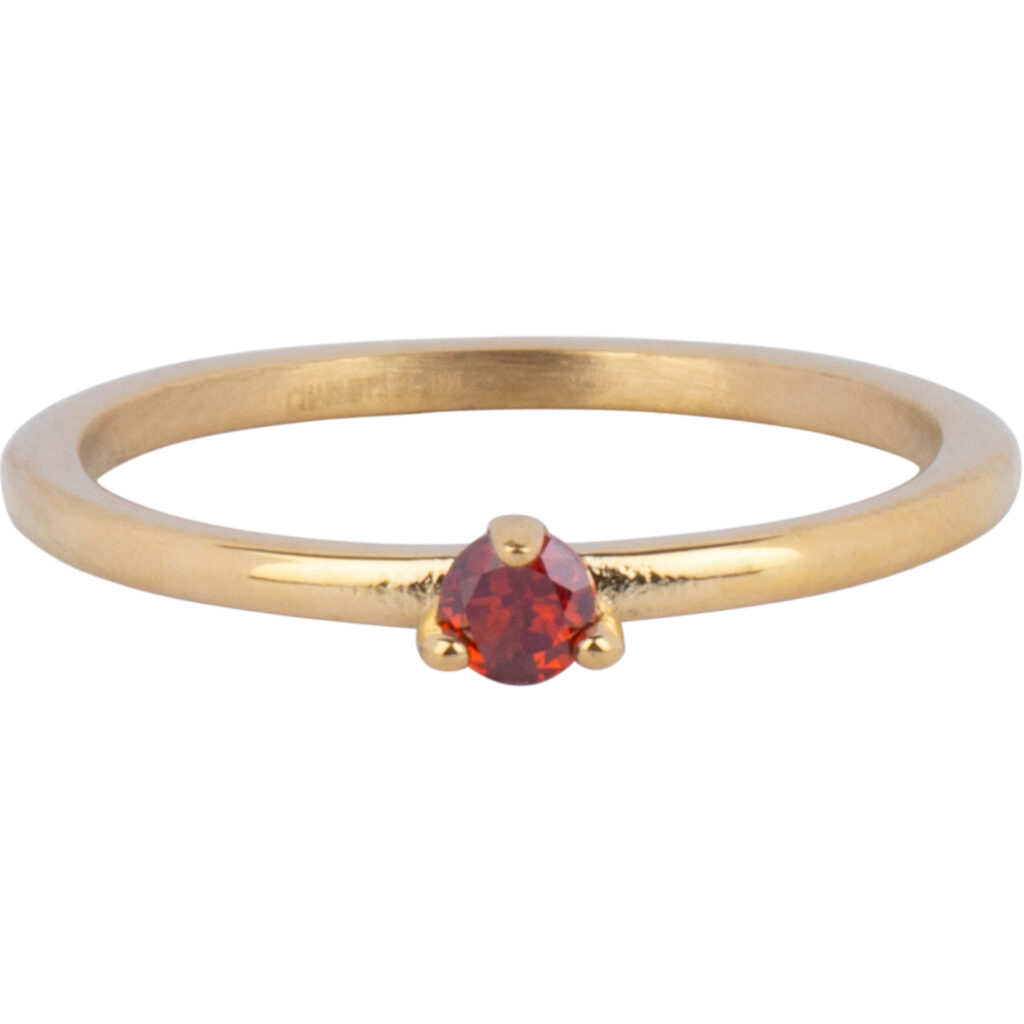 Stalen vintage klassieke ring “Charmin’s Driehoek Solitair Ring Rode Steen Goudkleurig Staal R1301” van het fashion sieradenmerk Charmin’s met bijzonder driehoek zetting.