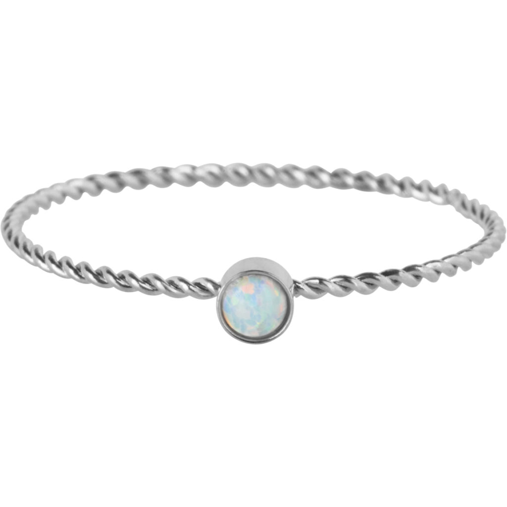 Stalen stapelring “CCharmin’s Gedraaide Birthstone Ring Opaal Staal R1460” van het fashion sieradenmerk Charmin’s.