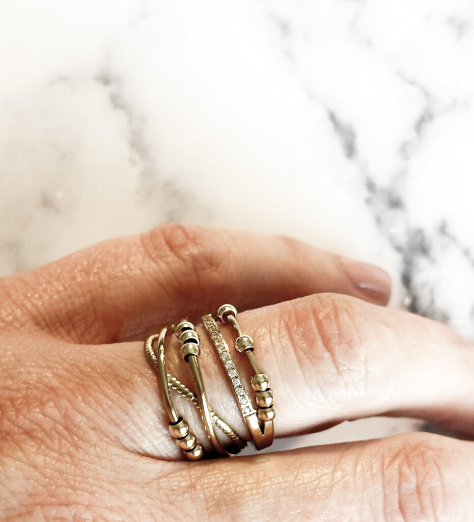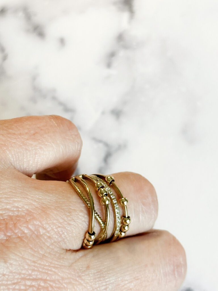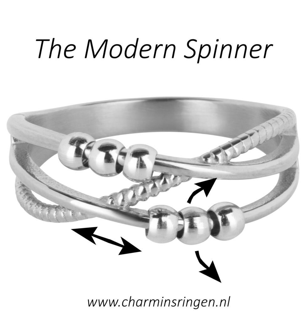 Het is een kunstwerkje; de ring bestaat uit drie doorelkaar gevlochten ringen, al dan niet bewerkt, en heeft 2 ringen met balletjes waar je heerlijk aan kan draaien.