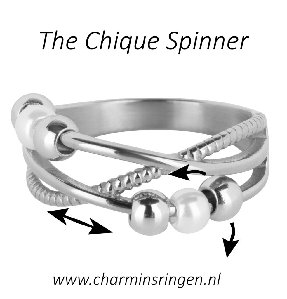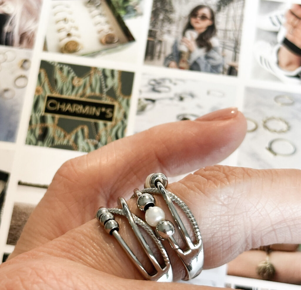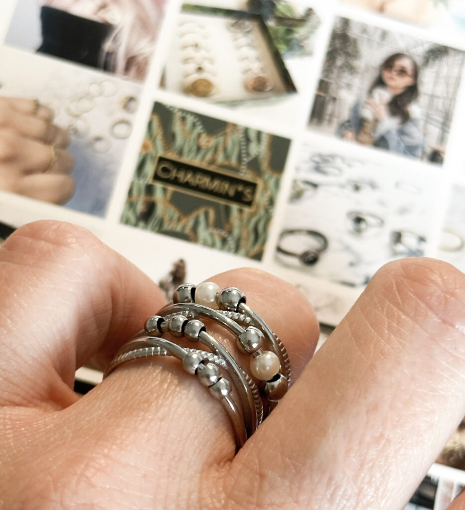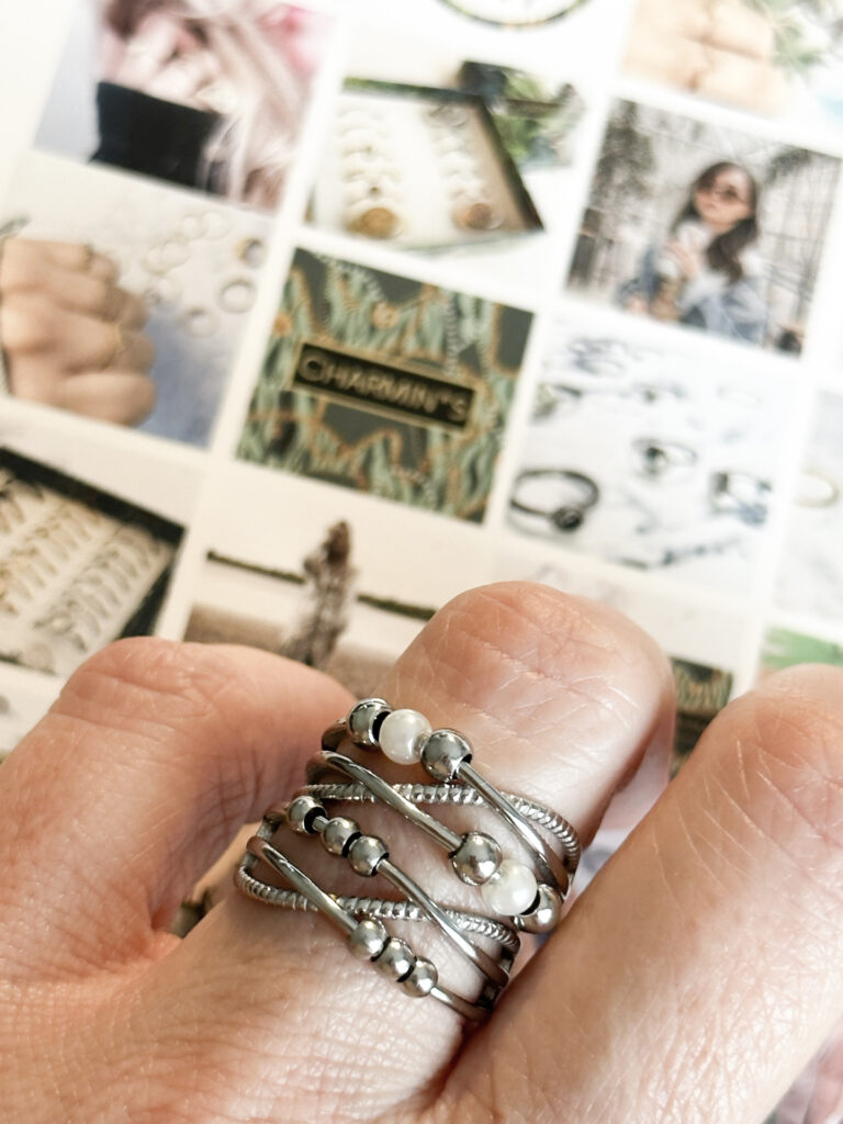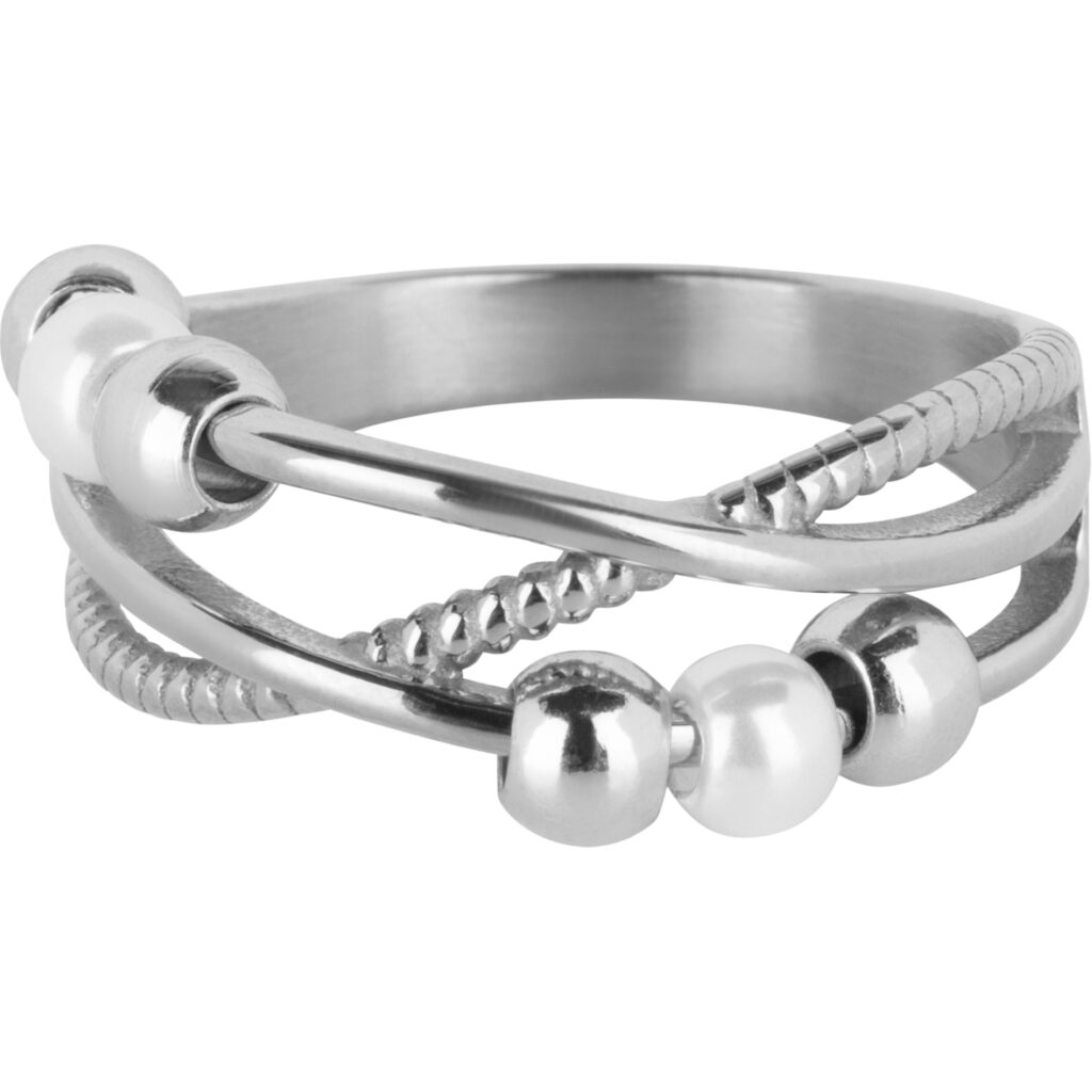 Stalen sierlijke ring met balletjes en parels “Charmin’s Gedraaide Ring Balletjes en Parels Anxiety Fidget Staal R1362” van het fashion sieradenmerk Charmin’s.