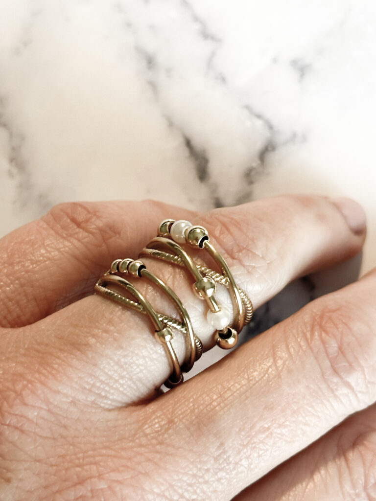 Het is een kunstwerkje; de ring bestaat uit drie doorelkaar gevlochten ringen, al dan niet bewerkt, en heeft 2 ringen met balletjes en parels waar je heerlijk aan kan draaien.