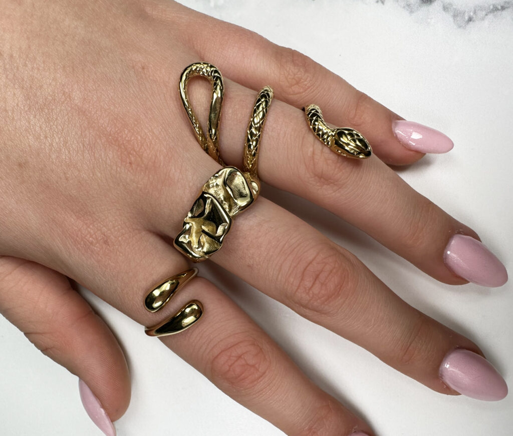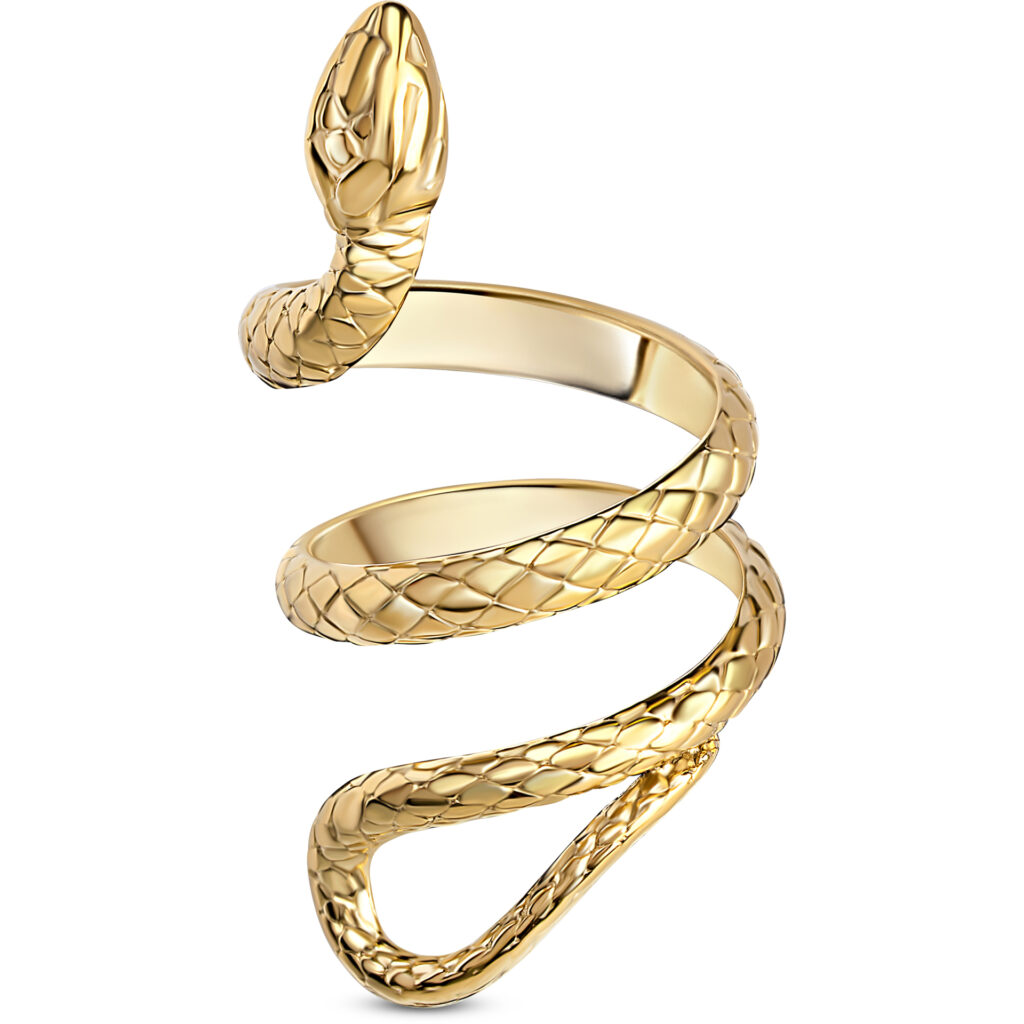 Gedurfd en mysterieus: deze chunky ring R1848 met goudkleurige slang kronkelt elegant om je vinger. Een krachtig statement voor wie niet bang is om op te vallen.