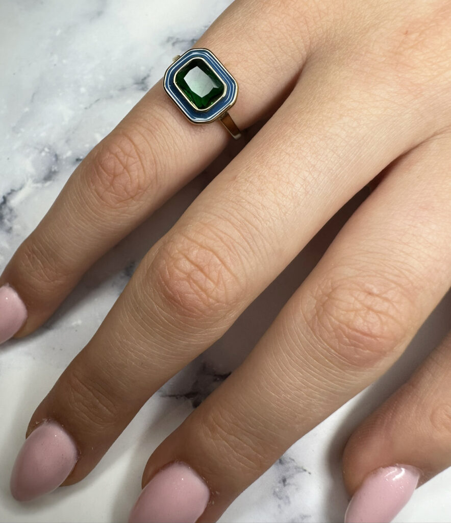 Charmin’s Goudkleurige Chunky Ring met Blauw Emaille en Groene Steen – Chic en Vintage