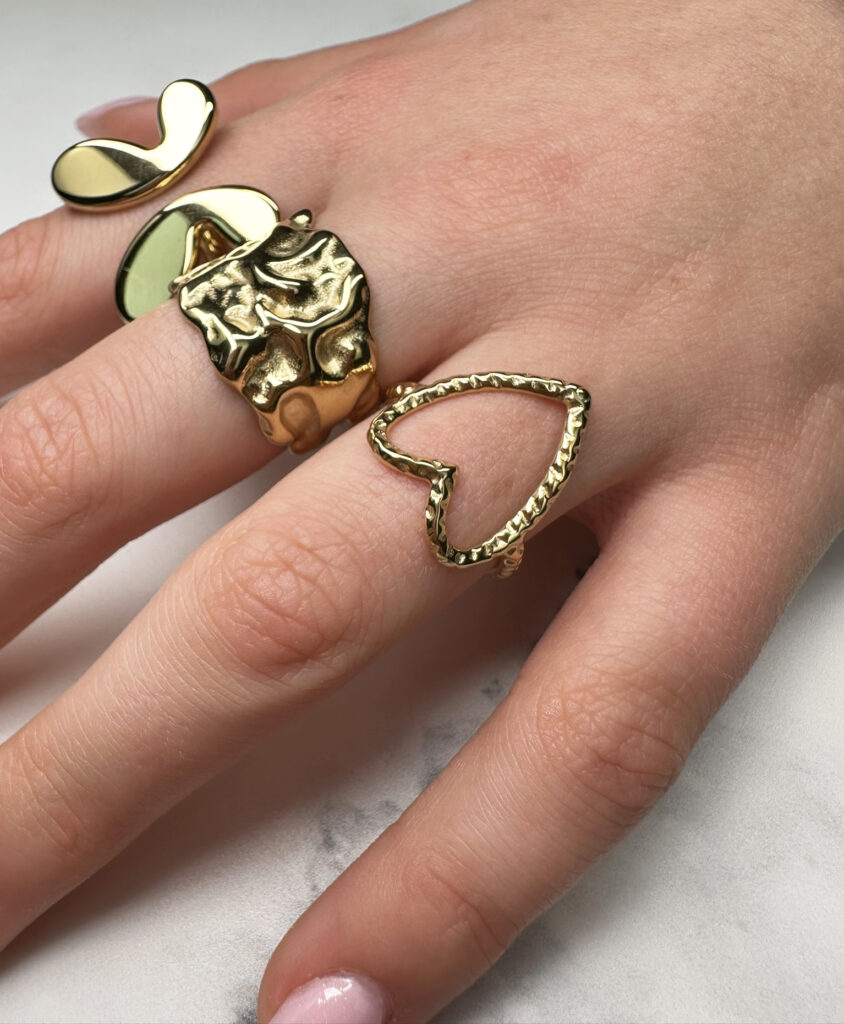 De abstracte vlinder op deze goudkleurige chunky ring (R1858) staat symbool voor transformatie, vrijheid en nieuwe energie. Vlinders zijn een universeel teken van verandering en groei, en brengen een gevoel van lichtheid en elegantie.