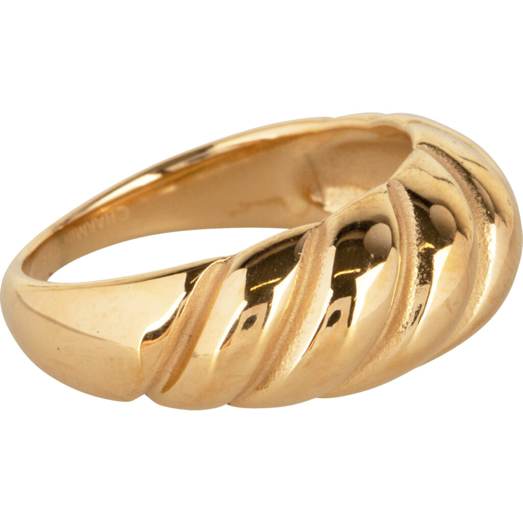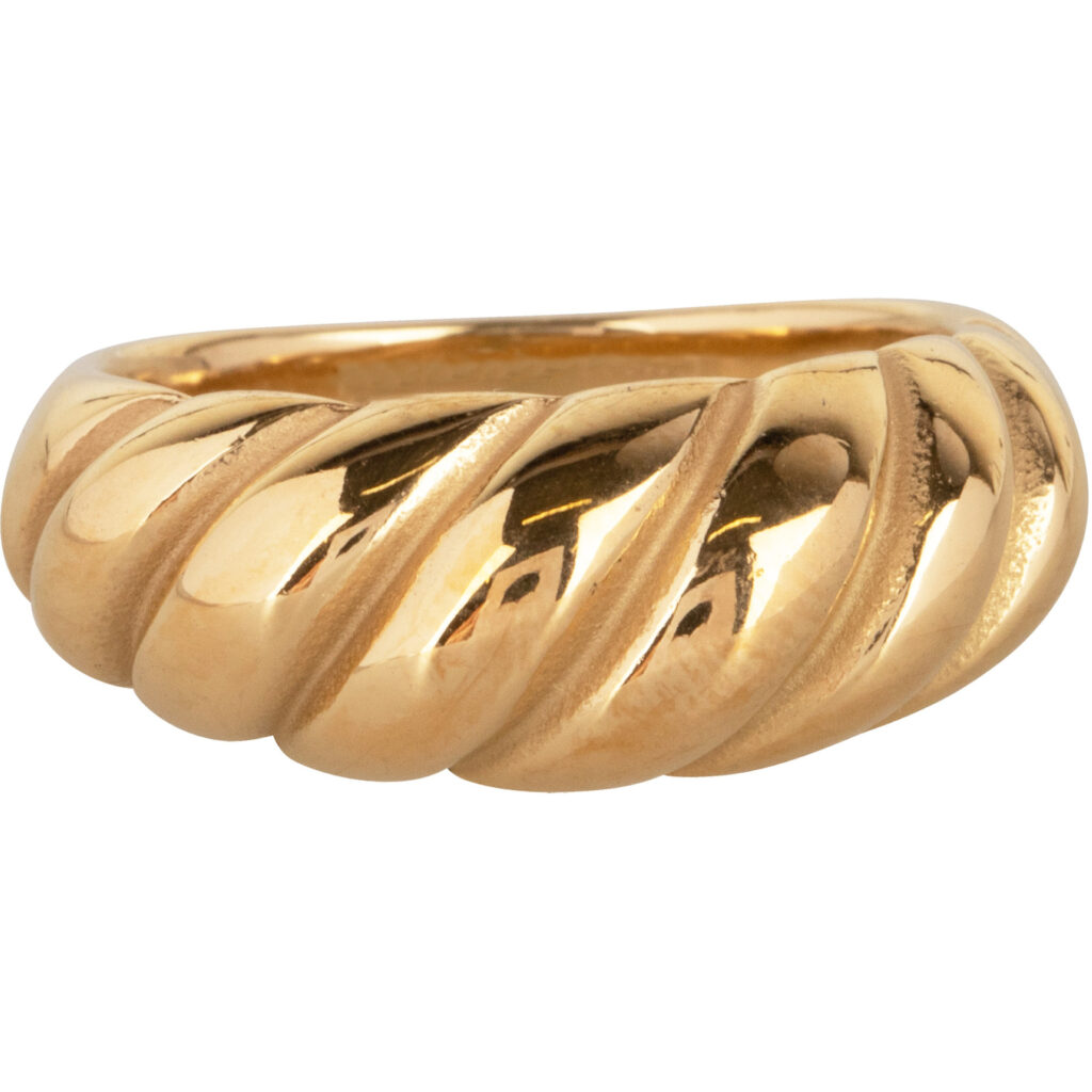 Het gedraaide ontwerp van deze ring roept de beweging en zachtheid van een croissant op, terwijl het tegelijkertijd een tijdloze elegantie uitstraalt. De ring voegt een speelse, maar toch verfijnde touch toe aan elke look.