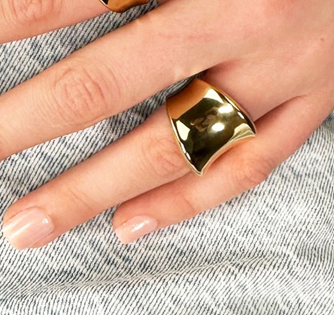 Met zijn halve vinger bedekkende formaat is het een krachtig statement piece dat je vingers langer laat lijken.