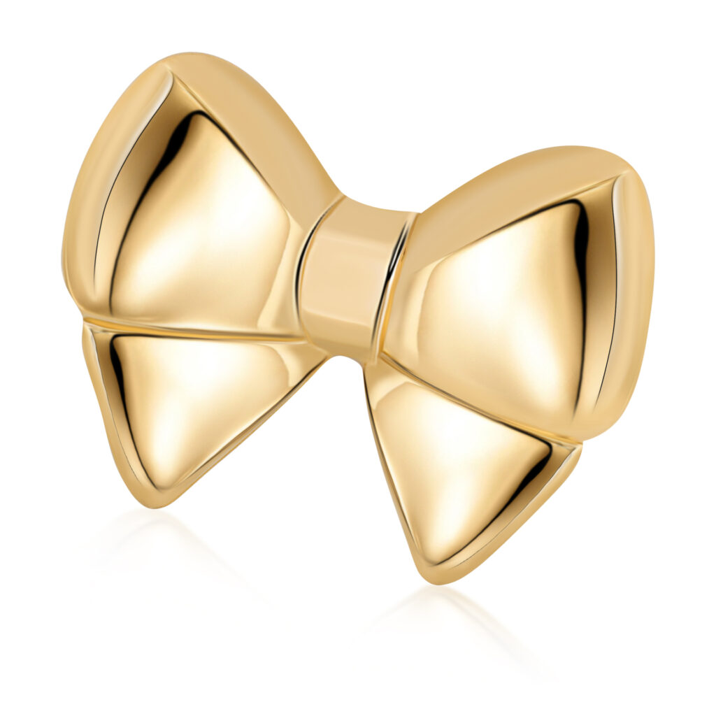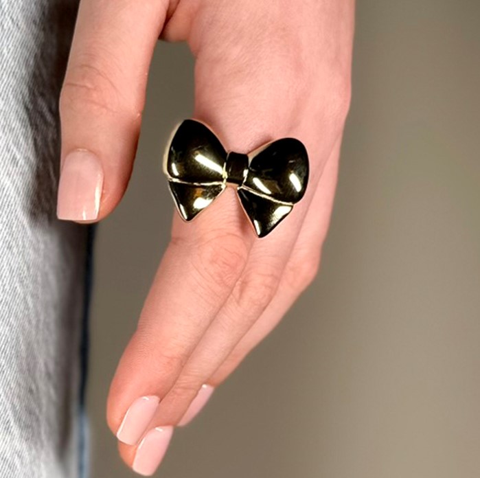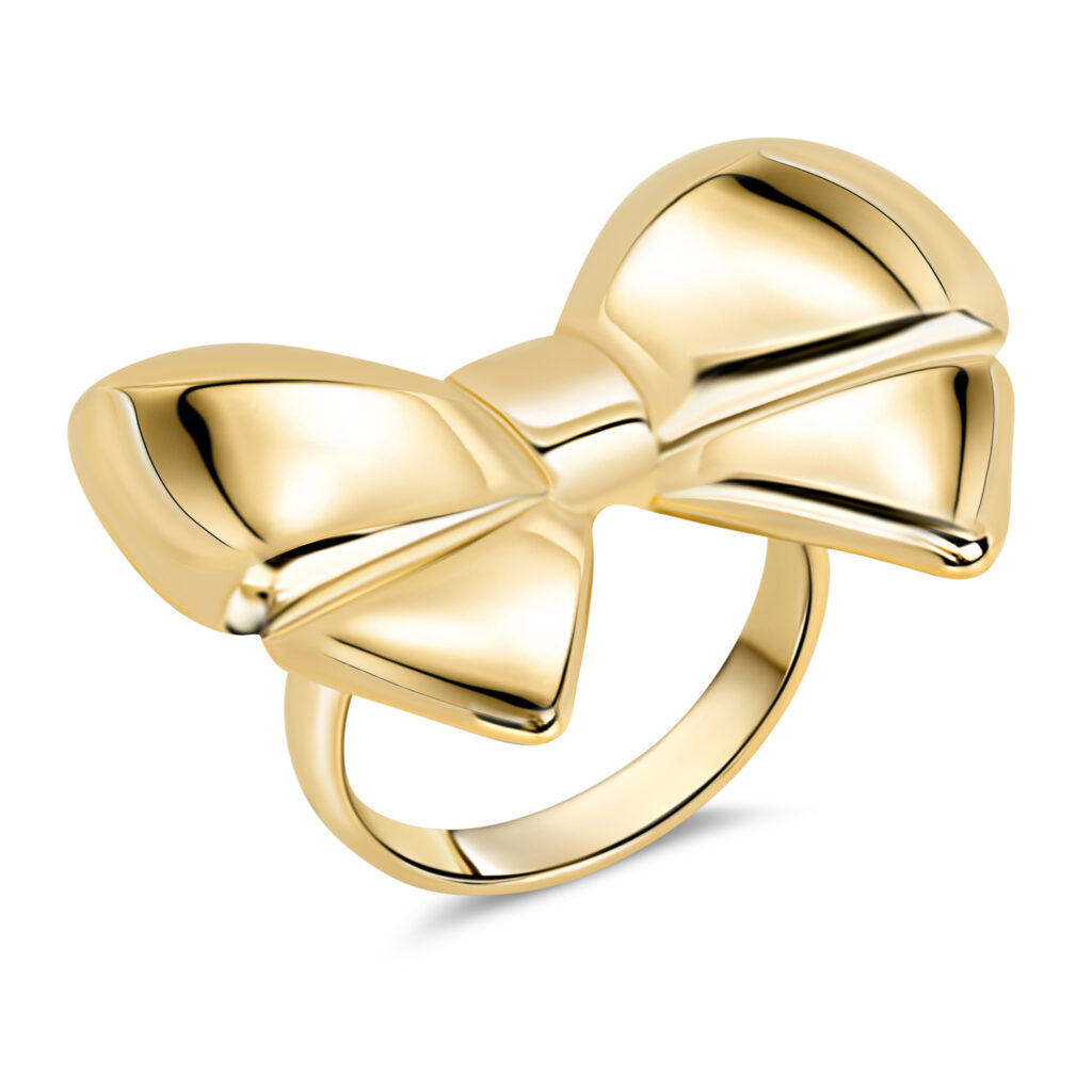 Deze opvallende “Charmin’s Goudkleurige Chunky Ring met Grote Strik Staal R1788” met een grote strik voegt een speelse en toch elegante touch toe aan elke outfit.