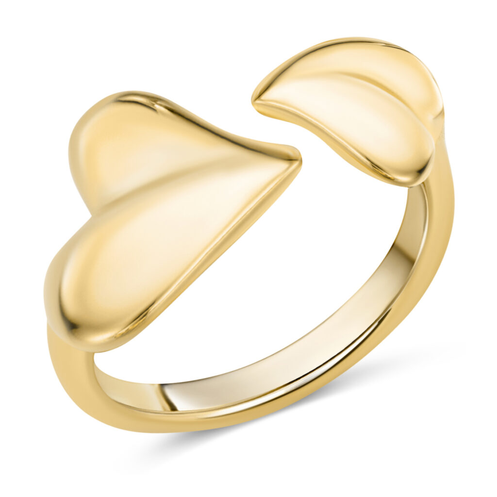 Deze opvallende “Charmin’s Goudkleurige Chunky Ring met Twee Hartjes Staal R1773” heeft twee hartjes die elkaar net niet raken, maar perfect verbonden zijn.