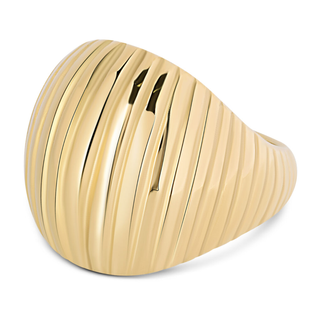 De bolvormige ring straalt een klassieke elegantie uit, terwijl de verticale gravure zorgt voor een modern contrast. Een opvallend sieraad dat moeiteloos kracht en verfijning combineert.