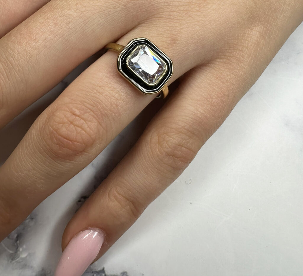 De ring is stevig maar elegant vormgegeven, met een vloeiende band die comfortabel om je vinger sluit. Het contrast tussen wit en zwart geeft de ring een moderne uitstraling met een vleugje retro.