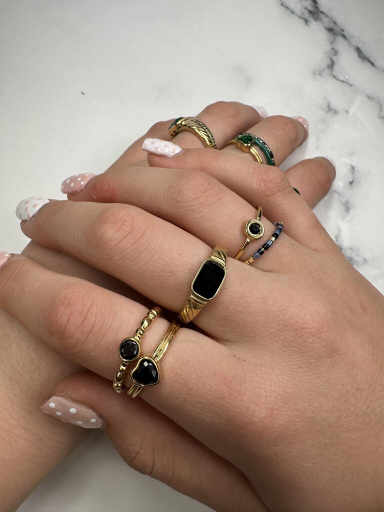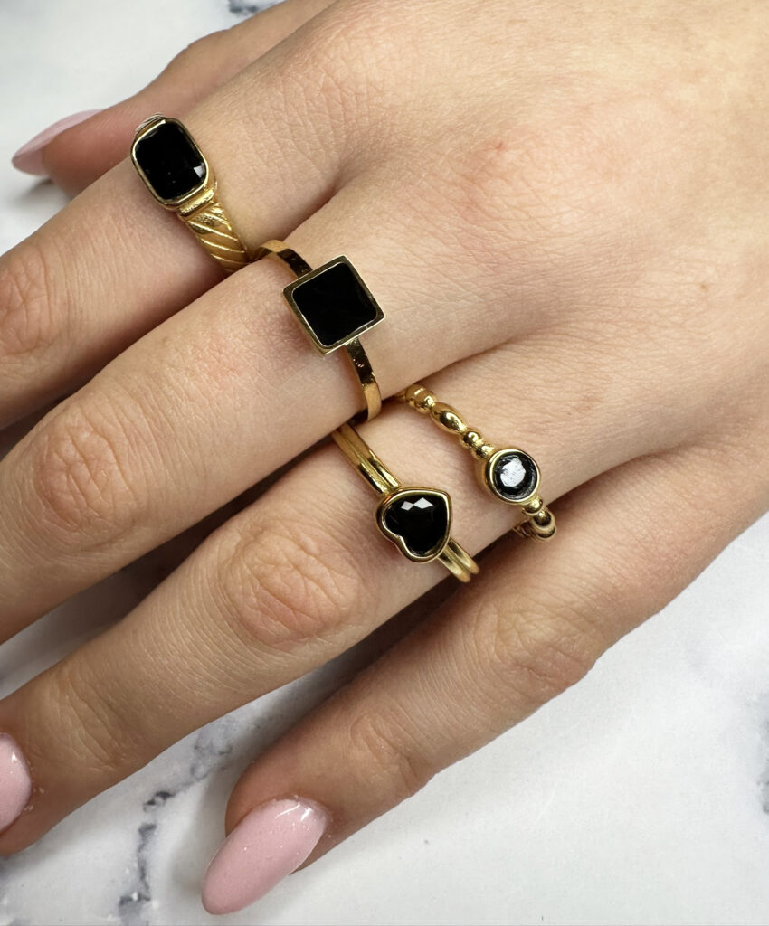 De ring ligt fijn om je vinger en voelt licht. Het zwarte hartje valt subtiel op en geeft een klein accent. Zo krijgt een eenvoudige ring net dat beetje extra uitstraling. De combinatie van goudkleurig met zwart maakt deze ring een tijdloze eyecatcher voor elke outfit.