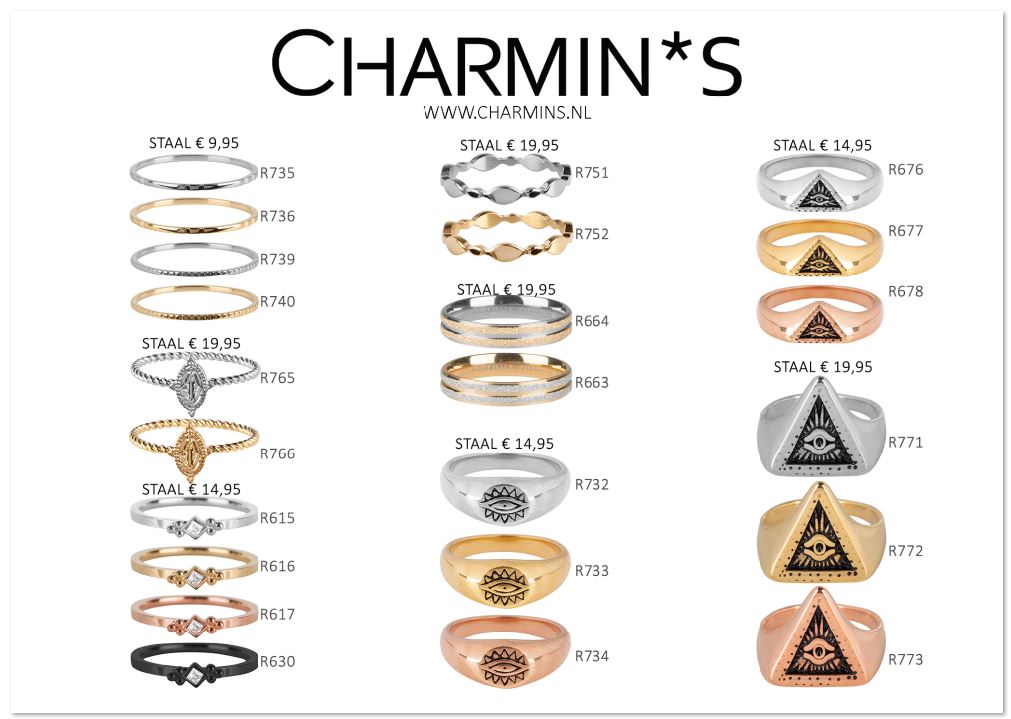 Kleuren: De ringetjes van Charmin’s zijn verkrijgbaar in staal en geel-goldplated. Sommige modellen zijn ook verkrijgbaar in rosé goldplated en zwart.
