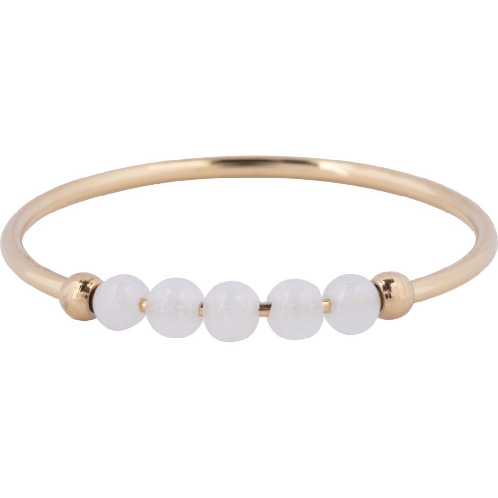Stalen Fidget ring “Charmin’s Goukleurige Anxiety Ring Natural Stones Witte Maansteen Beads Staal R1327” van het fashion sieradenmerk Charmin’s. Ring van 1mm versierd met 5 draaiende halfedelstenen kr