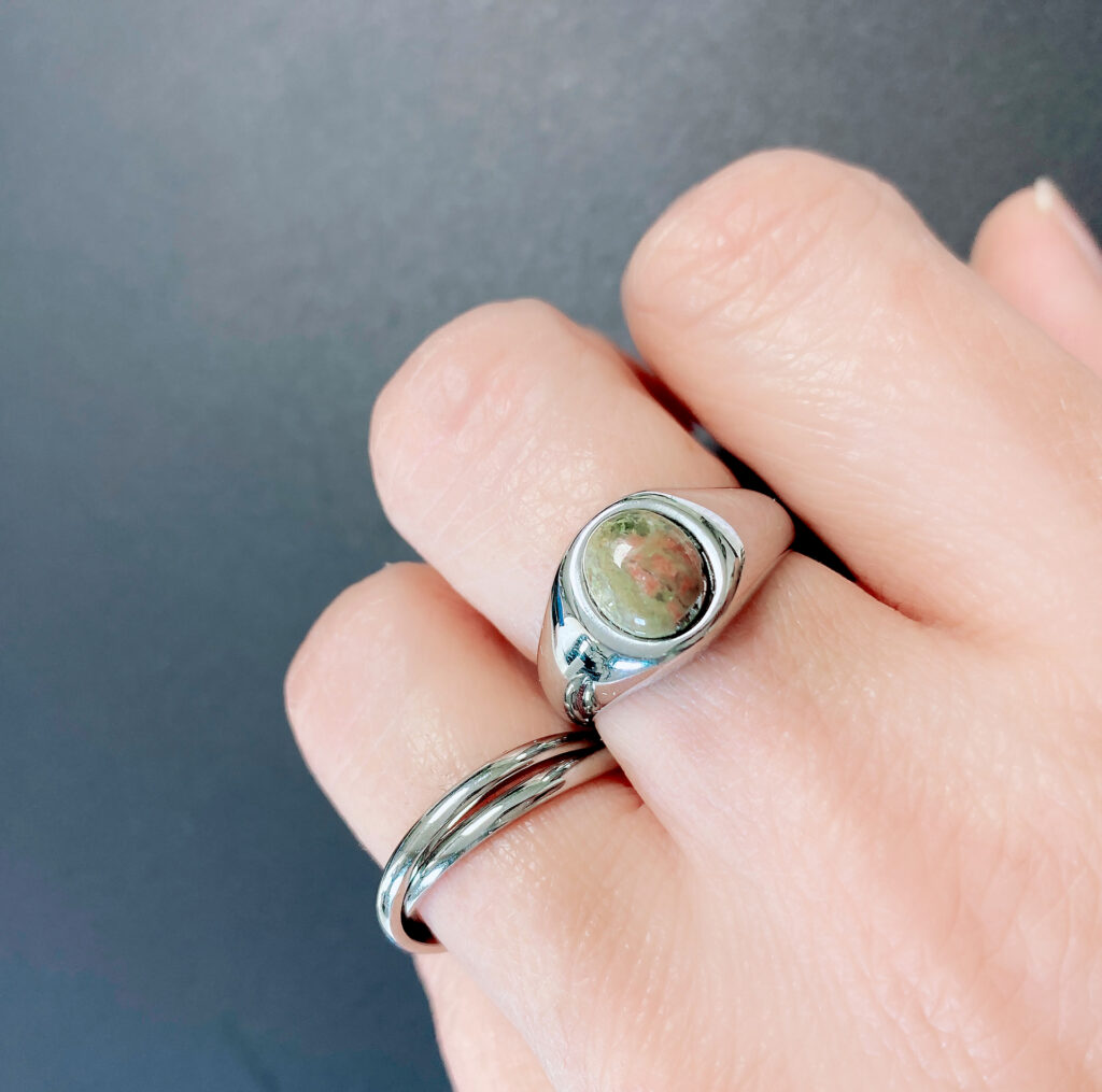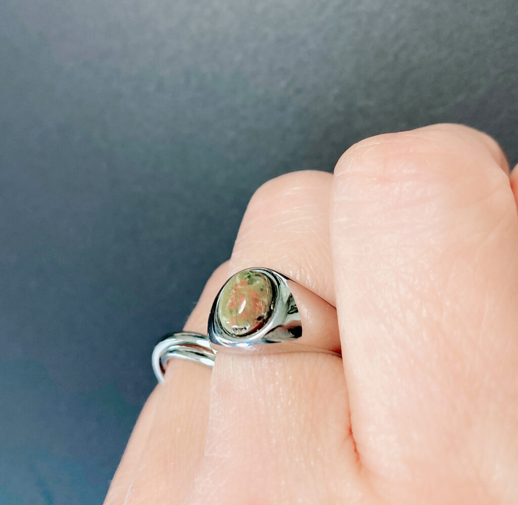 Prachtig mooie ronde zegelring met een ovale unakiet edelsteen.