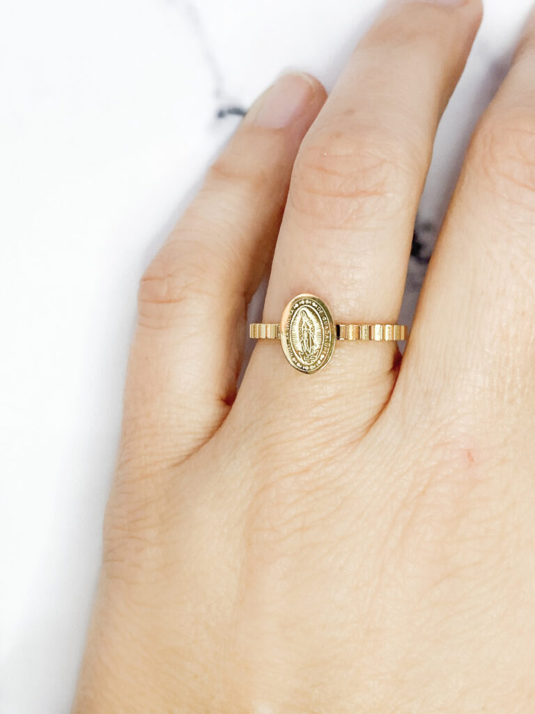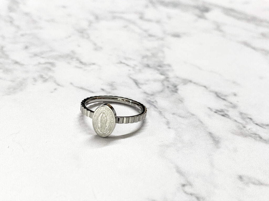 De Charmin's ringen met "munten" zijn niet aan te slepen. Deze kanjer van een ring is het helemaal! De ring zelf is 1,5*2mm en deze is versierd met een munt van Maria. De afmeting van de munt is 1*8*2mm. De gehele ring is van 316L staal.