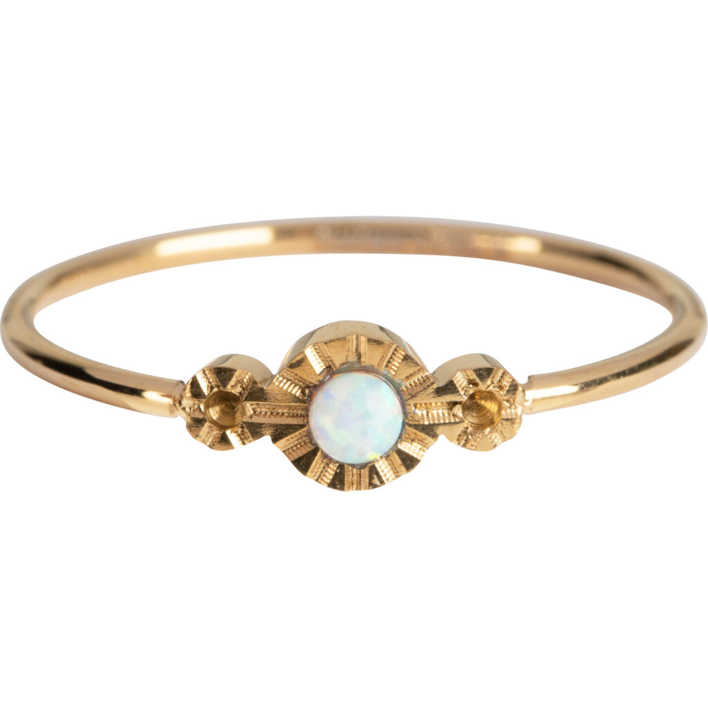 Wat draagt deze Charmins ring fijn en wat is het een beauty! De ring is gemaakt van 316:L staal en heeft een diameter van 1mm. De ring is versierd met 3 ronde elementen waarvan de middelste versierd is met een opaal steen van 2,5mm diameter.