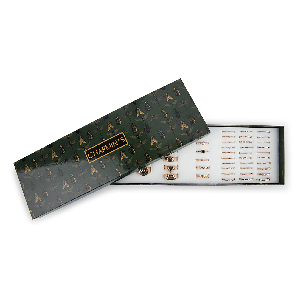 Dit luxe Charmins doosje gebruik je ter display of als giftbox. Er is in totaal plek voor 46 ringen, verdeeld in vlakken van 30-12 en 4 gleuven. Met een tredy artdeco opdruk. Mooi om te krijgen, cadeau te geven en al je ringen in te bewaren.