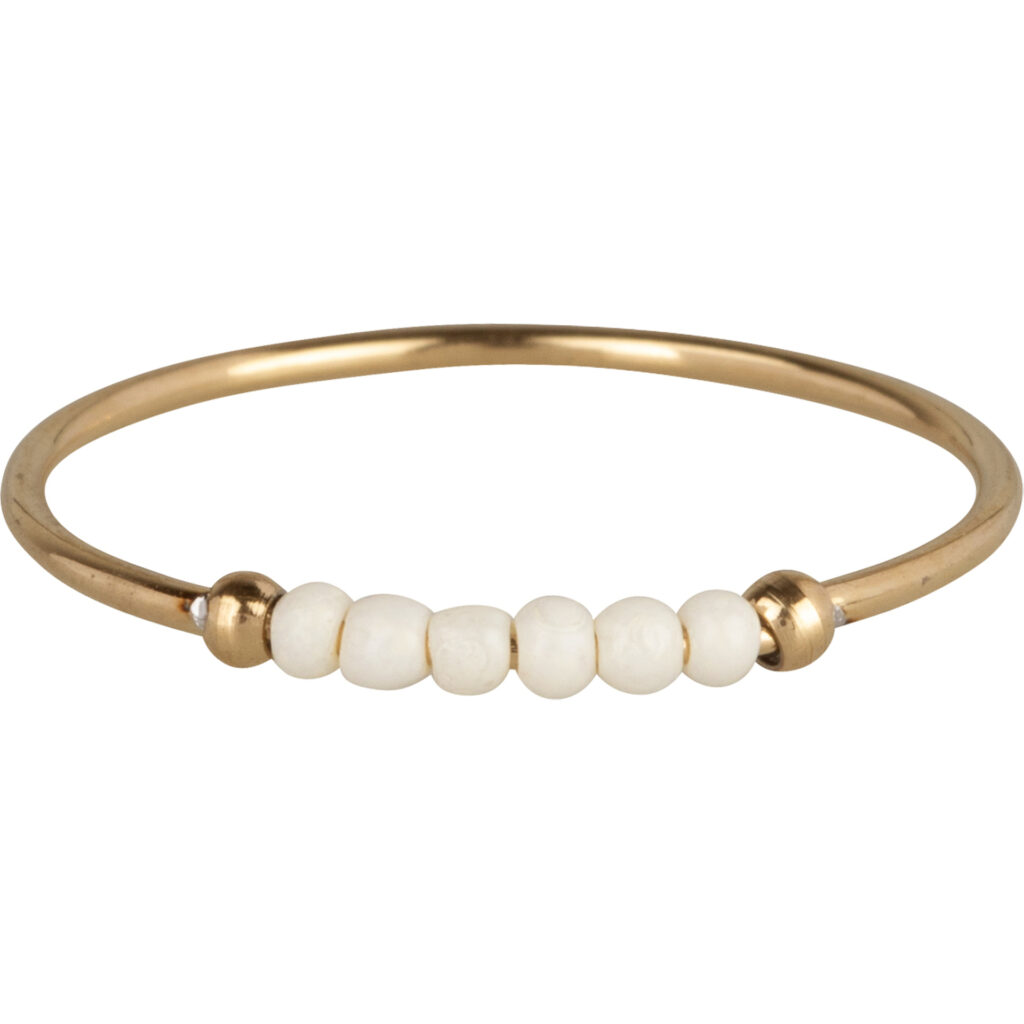 Stalen Anxiety ring “R0989 Anxiety Ring Palm White Beads Goldplated ” van het fashion sieradenmerk Charmin’s. Ring van 1mm versierd met 5 draaiende kraaltjes.