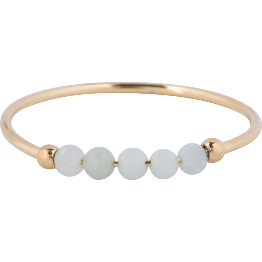 Stalen Fidget ring “Charmin’s Anxiety Ring NaturalStones Amazonite Beads Gold R1325” van het fashion sieradenmerk Charmin’s. Ring van 1mm versierd met 5 draaiende halfedelstenen kraaltjes.