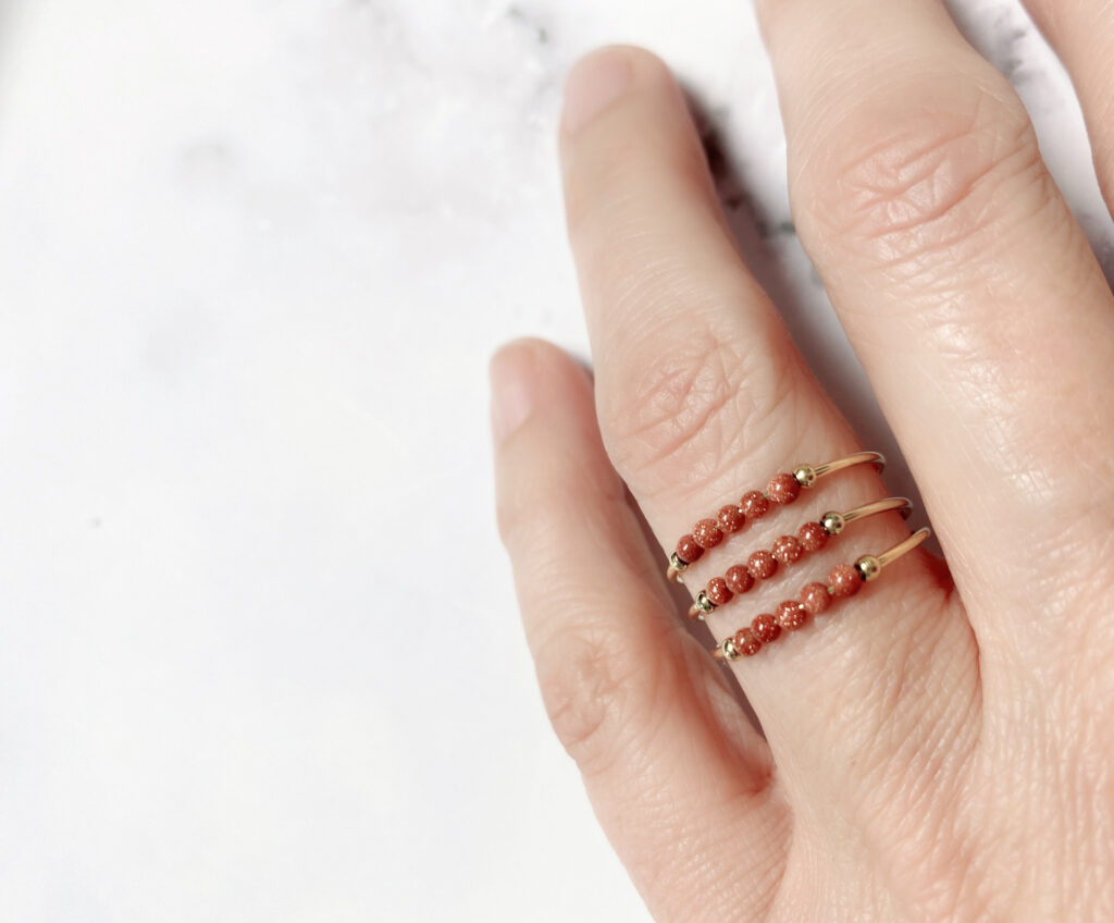 Stalen Fidget ring “Charmin’s Anxiety Ring Roodbruin Goudsteen Edelsteen Kraaltjes Goldplated Palm R1205”. Ring van 1mm versierd met 5 draaiende kraaltjes van edelsteen.