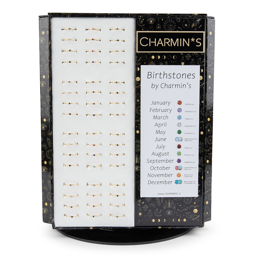 Deze luxe staande draaidisplay van Charmin’s is de perfecte keuze voor het presenteren van birthstone ringen in uw winkel.
