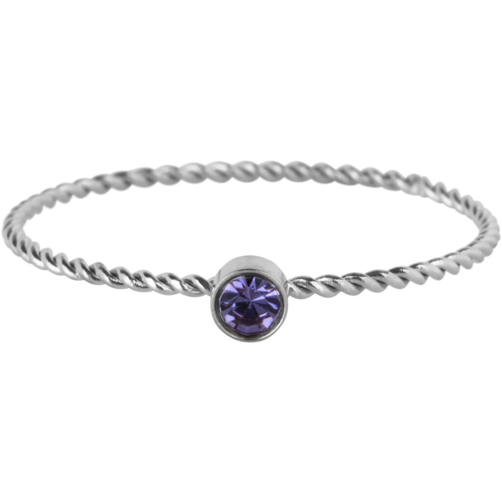 Stalen stapelring “Charmin’s Gedraaide Birthstone ring Red Kristal Staal R1458” van het fashion sieradenmerk Charmin’s. Maat 18 valt iets groter uit.