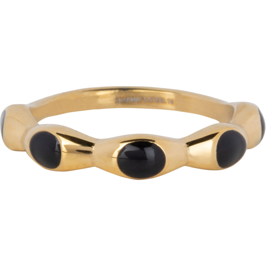 Stalen stapelring “Charmin’s Goudkleurig Ring Met Zwarte Ronde Emaille Bollen Staal R1494” van het fashion sieradenmerk Charmin’s.