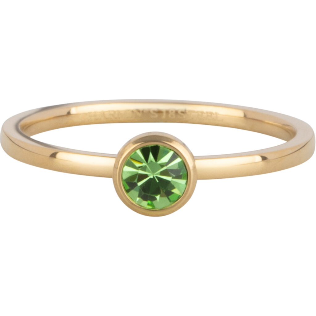 Stalen iconic ring “Charmin’s Goudkleurige Ring Birthstone Augustus Lichtgroene Kristal Staal Iconic R1602” van het fashion sieradenmerk Charmin’s.