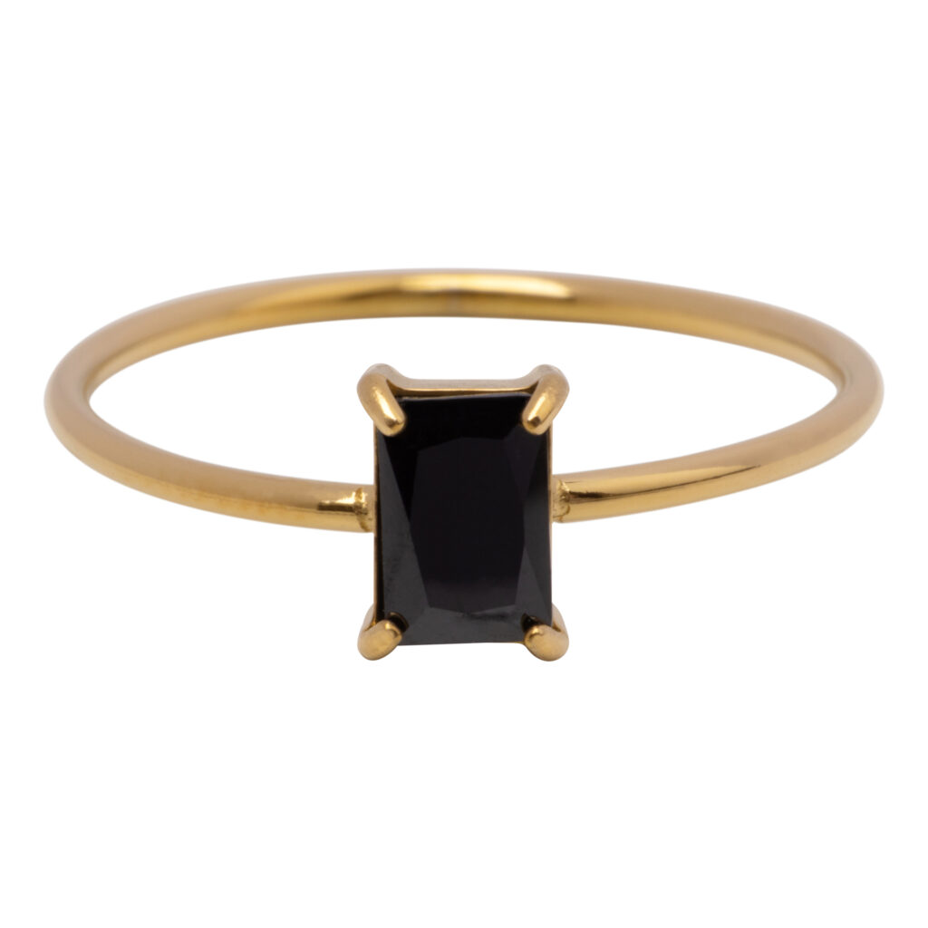 Stalen ring “Charmin’s Goudkleurige Ring Rechthoekig Zwart Steentje R1732 – Grafische Klasse” van het fashion sieradenmerk Charmin’s.