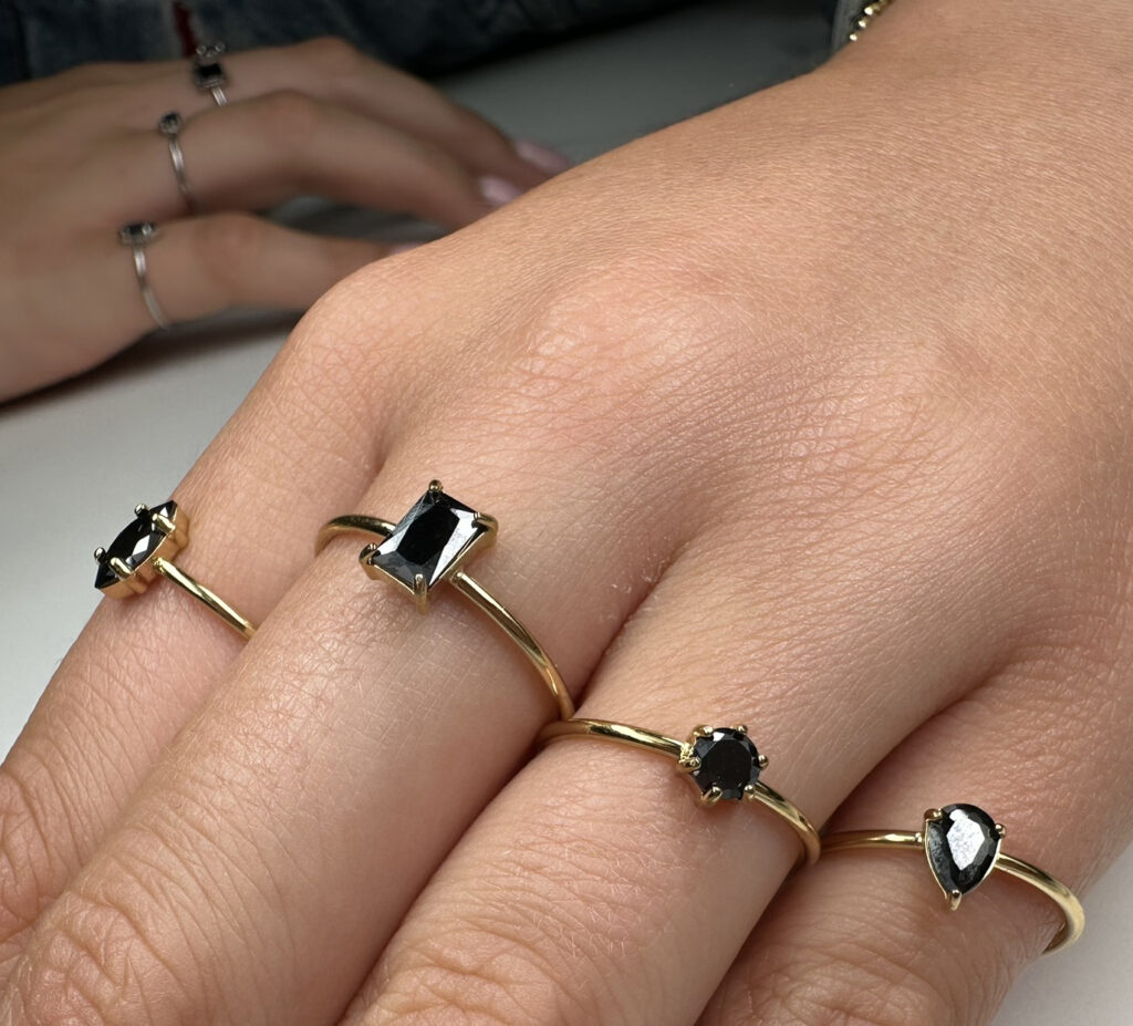 Met een zwarte rechthoekige steen en gouden band is dit een uitgesproken ring. Minimalistisch, krachtig en stijlvol.