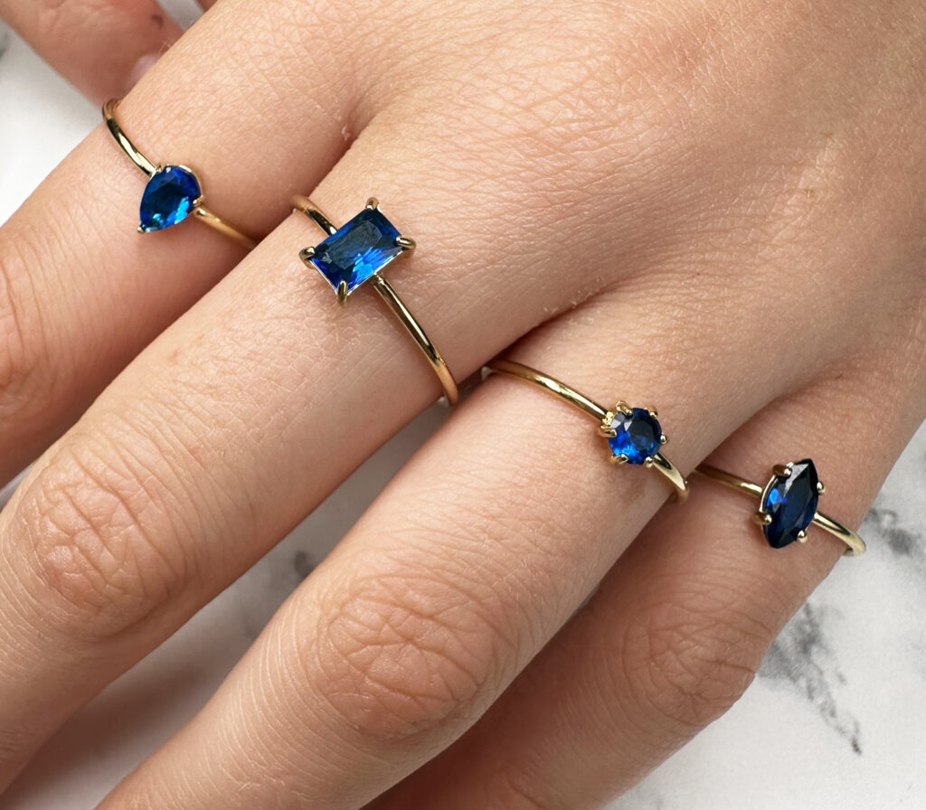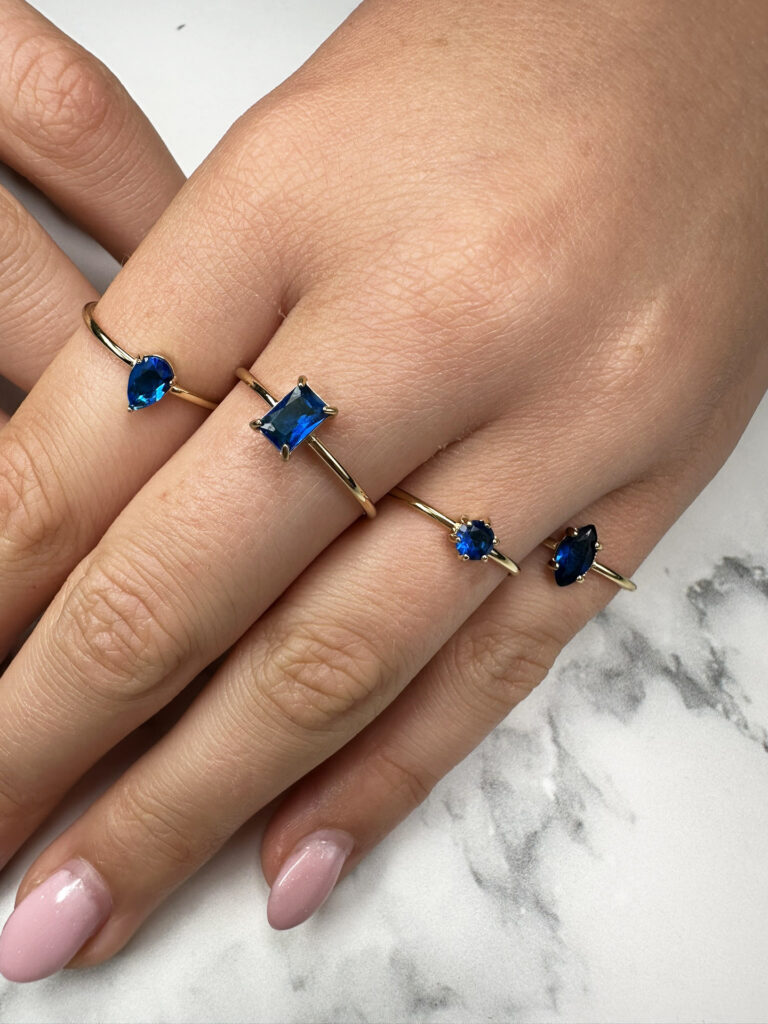 De donkere blauw tint steekt prachtig af tegen de warme goudkleurige band. Ideaal voor avondlooks of een krachtig statement.