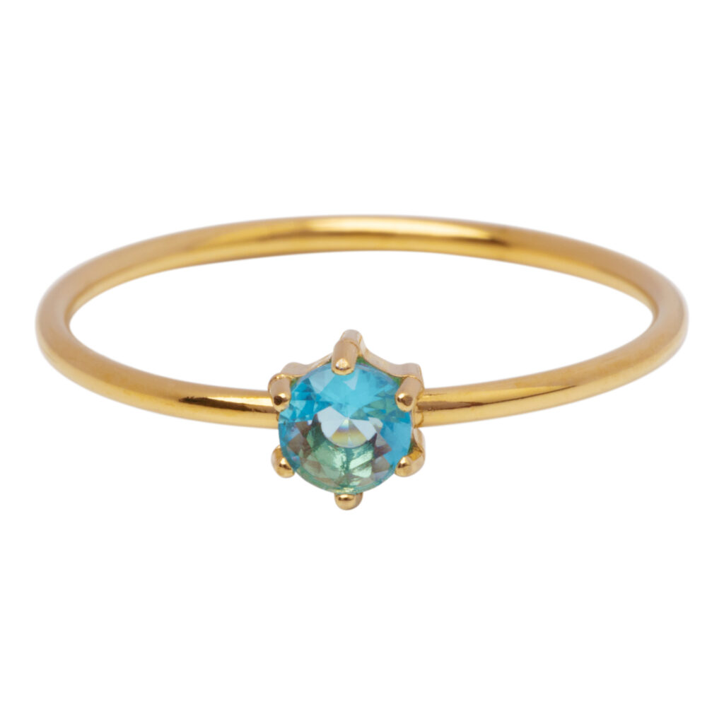 Stalen ring “Charmin’s Goudkleurige Ring Rond Lichtblauw Steentje Crystal R1709 – Zomers Licht” van het fashion sieradenmerk Charmin’s.