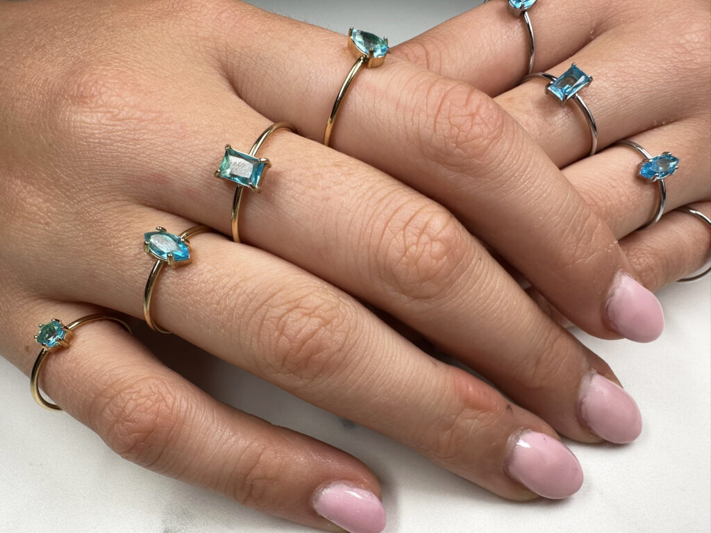 Deze ring ademt zomer. De lichtblauwe steen geeft je hand een frisse uitstraling. Perfect voor zonnige dagen of als vrolijke toevoeging aan je sieradenmix.