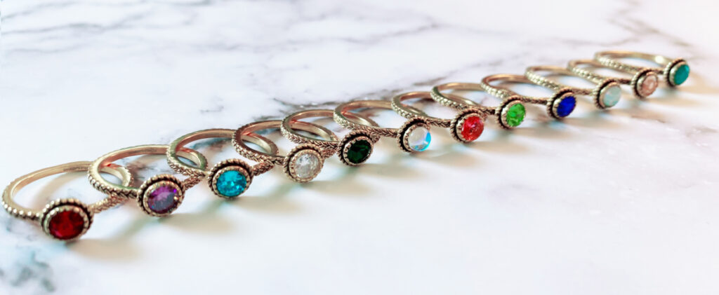Onze Charmin's Birthstones ringen bestaan uit twaalf unieke en kleurrijke ringen met geboortestenen.