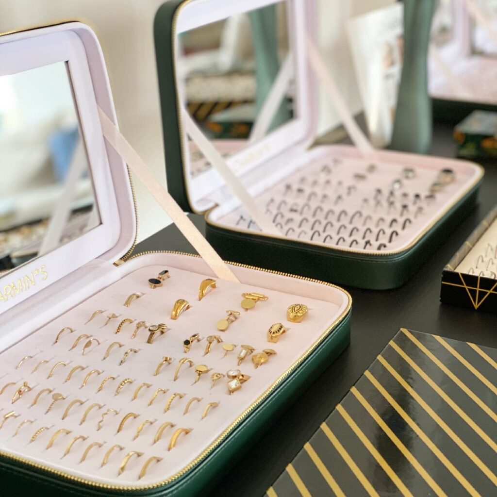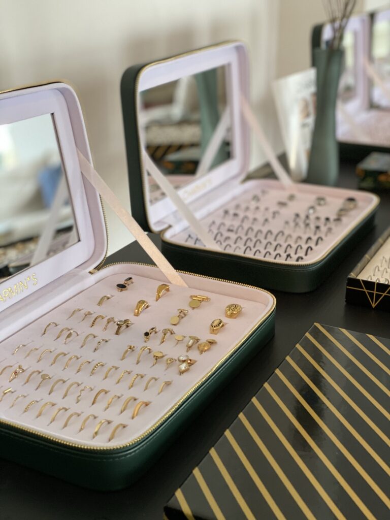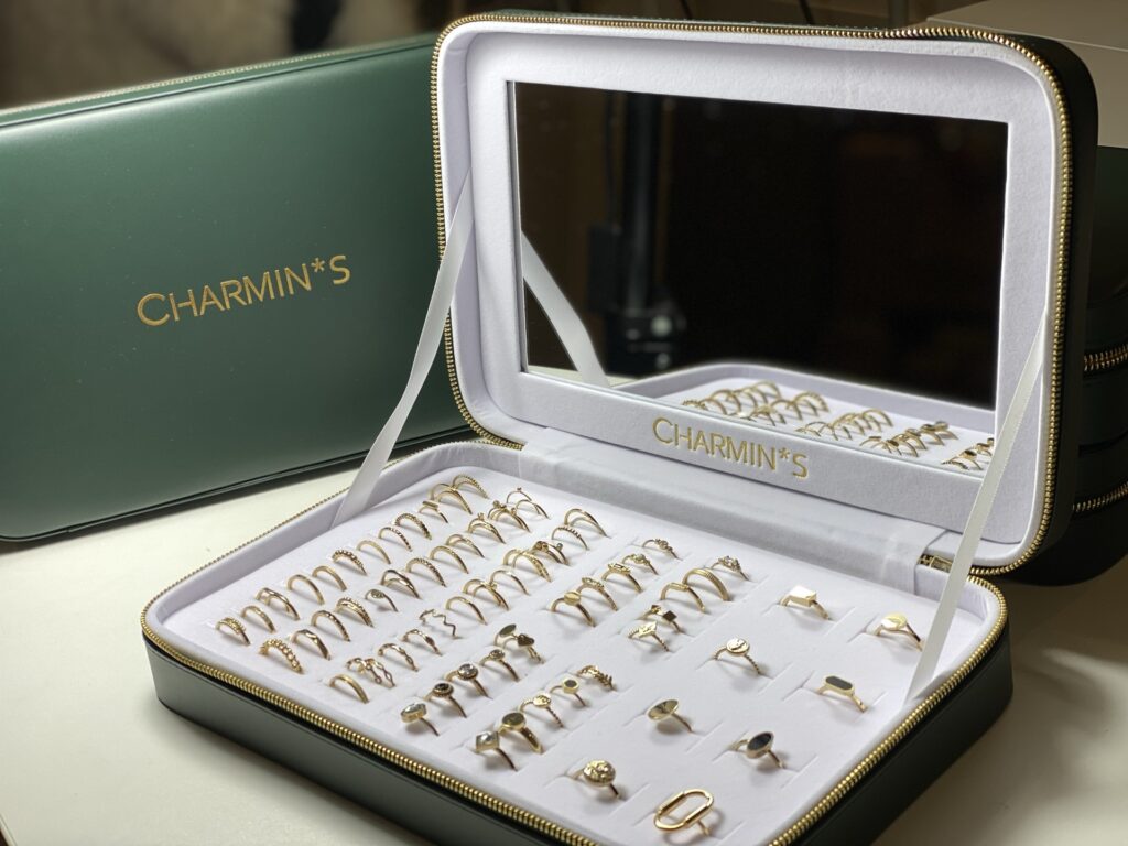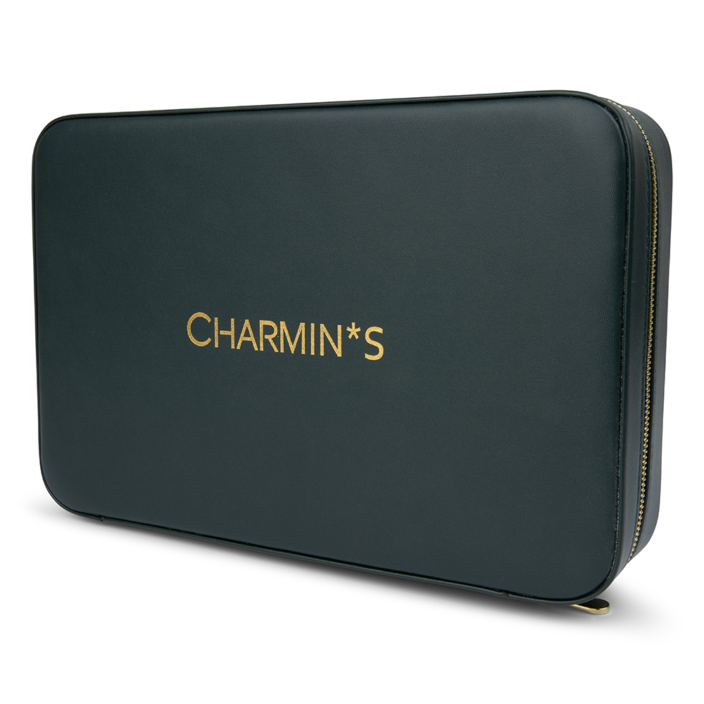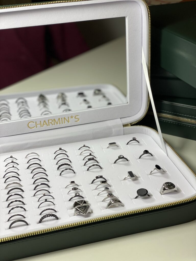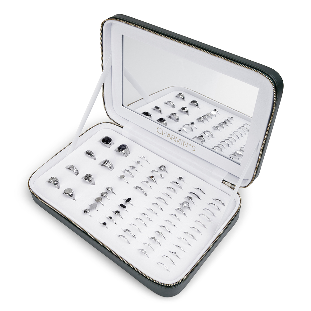 Luxe cadeau verpakking van Charmin’s Jewel Box Mirror. Deze box is gemaakt van vegan donkergroen leer met gouden logo op de box, rondom de box zit een goudkleurige rits. Binnenin een zit een mooie grote spiegel en gouden logo. Je hebt plek voor 64 ringetjes in het mooie witte vegan leer. De sieraden doos is 18 x 28 cm en 5,5 cm hoog.