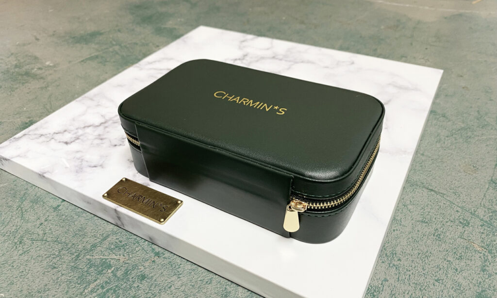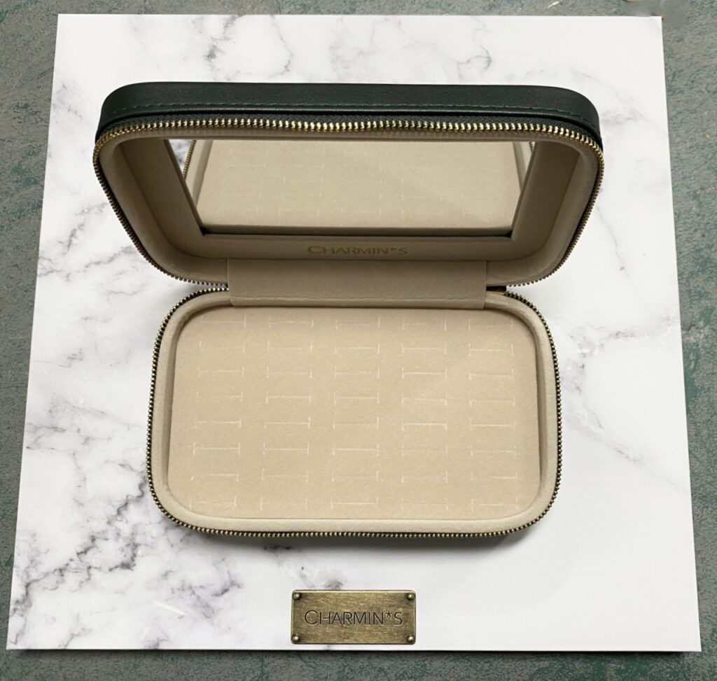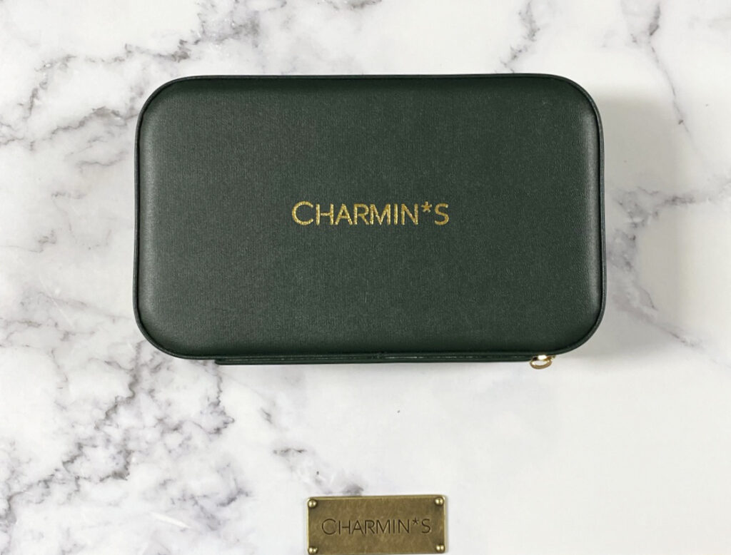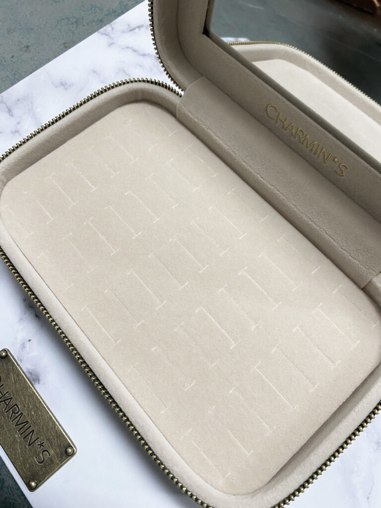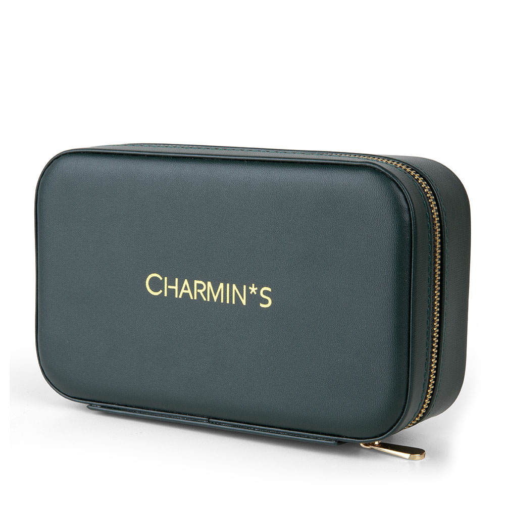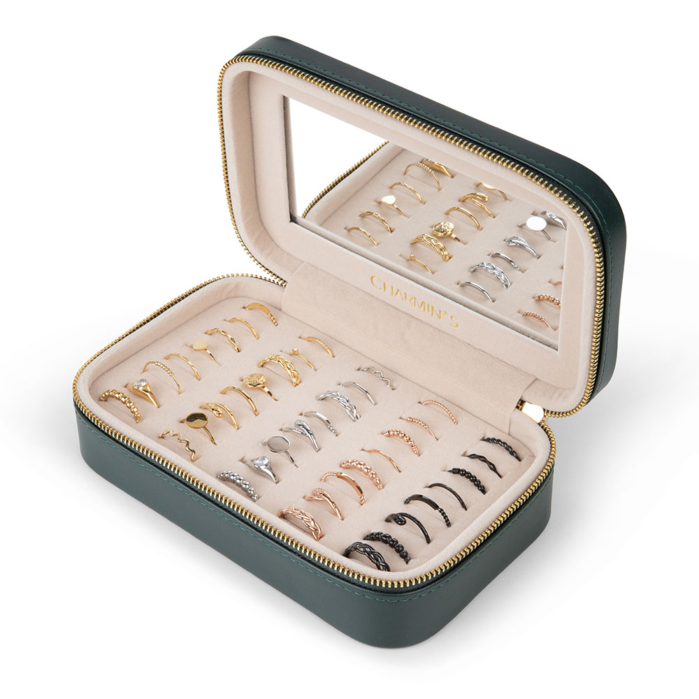 Luxe cadeau verpakking van Charmin’s Jewel Box Mirror. Deze box is gemaakt van vegan donkergroen leer met gouden logo op de box, rondom de box zit een goudkleurige rits. Binnenin een zit een mooie grote spiegel en gouden logo. Je hebt plek voor 40 ringetjes in het luxe creme kleurige fluweel. De sieraden doos is 18 x 11 cm en 5,5 cm hoog.