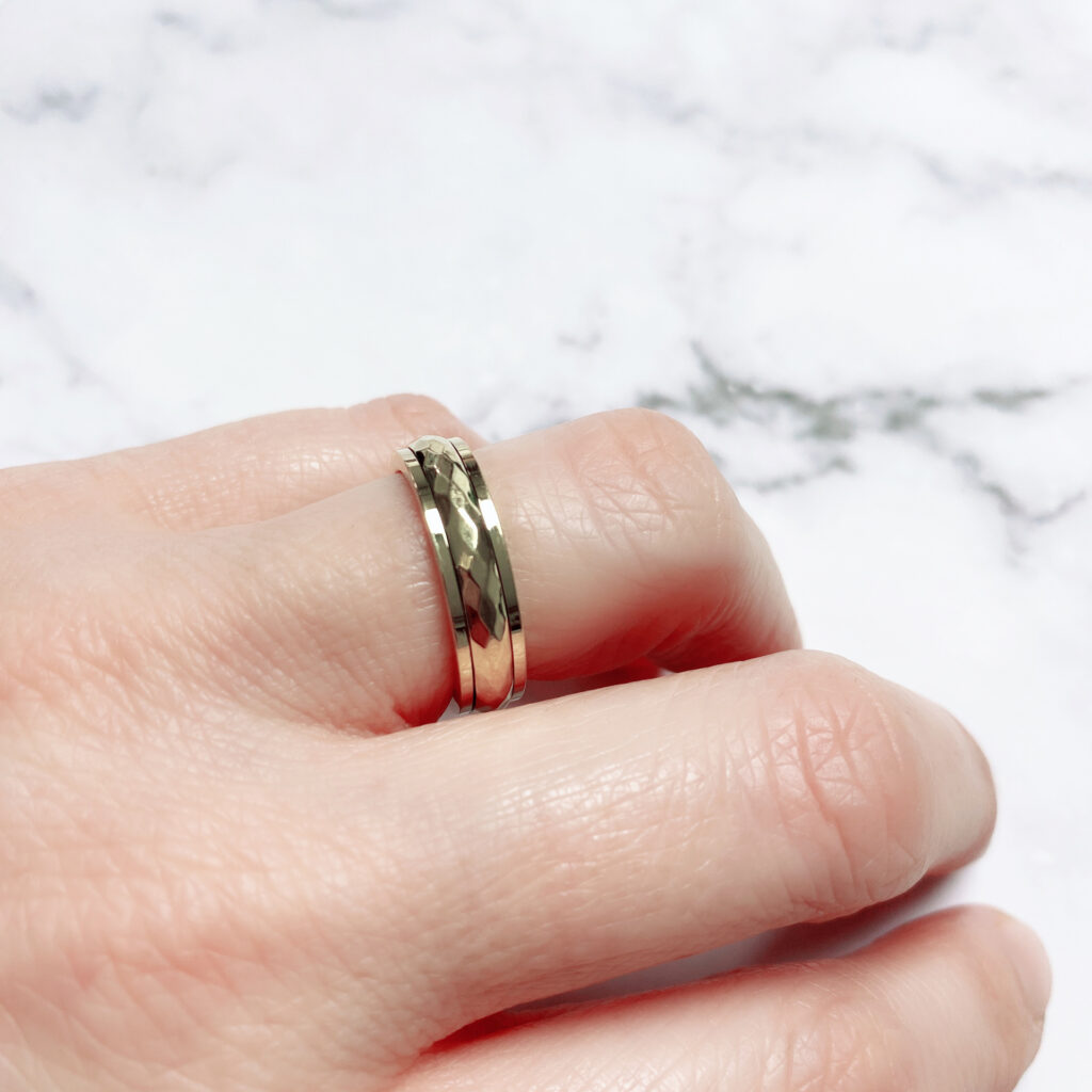 Deze Charmin’s anxiety stress ring is gemaakt van chirurgisch staal. Het is een ring om een ring, en die bovenste ring kan je heerlijk draaien, door het draaien wordt je vanzelf zen. De middelste ring is in ruit gehamerd, wat een heerlijk glimmend effect heeft.