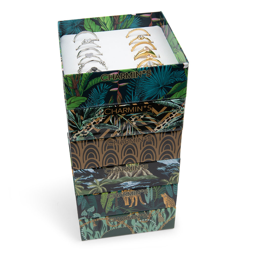 Presenteer je collectie met onze elegante kleine displaydoosjes, voorzien van een schitterende hoogglans print. Deze doosjes bieden plaats aan 24 van jouw mooiste ringen, prachtig gepresenteerd in luxe wit vegan leer.