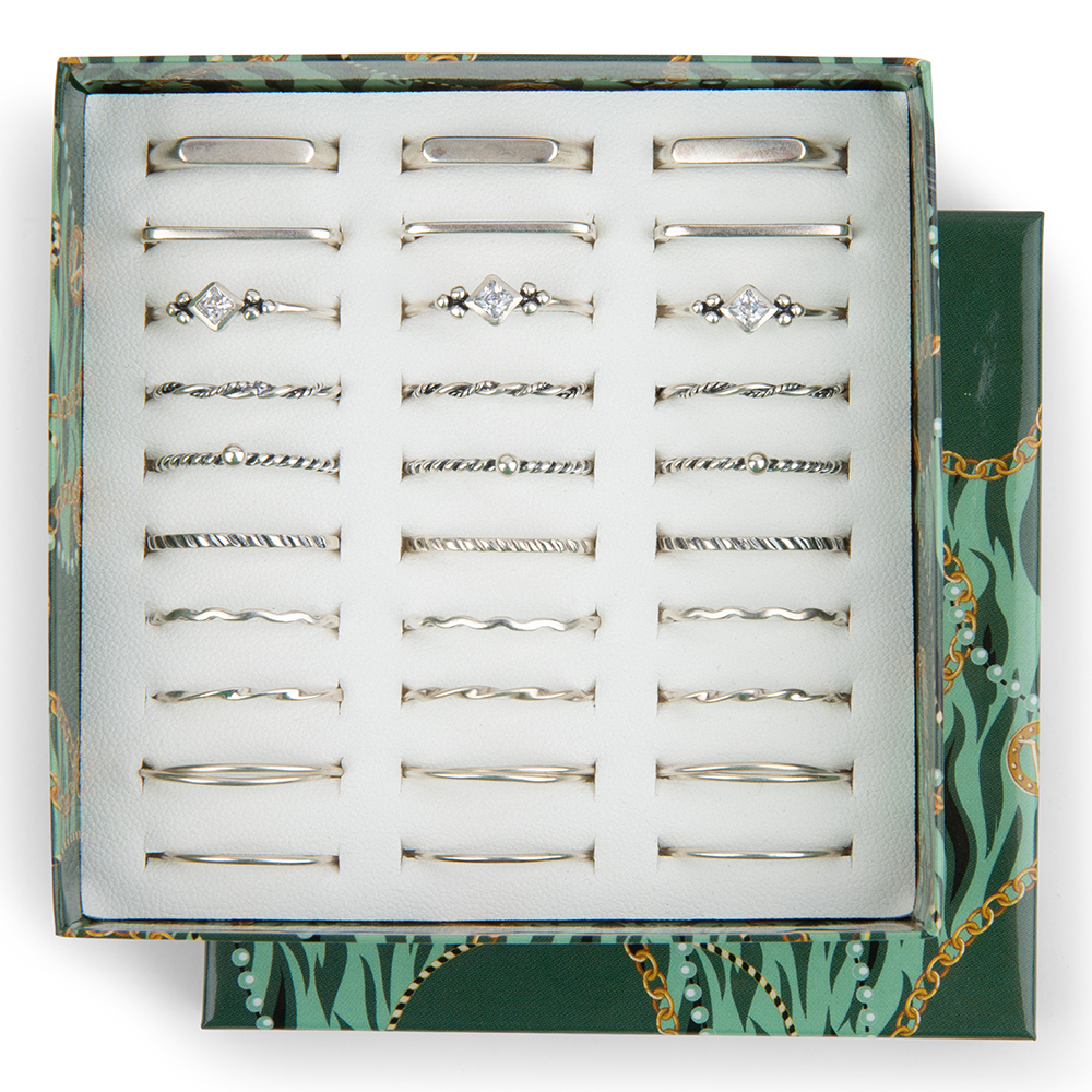 Presenteer je collectie met onze elegante kleine displaydoosjes, voorzien van een schitterende hoogglans print. Deze doosjes bieden plaats aan 30 ringen, allemaal prachtig gepresenteerd in luxe wit vegan leer.