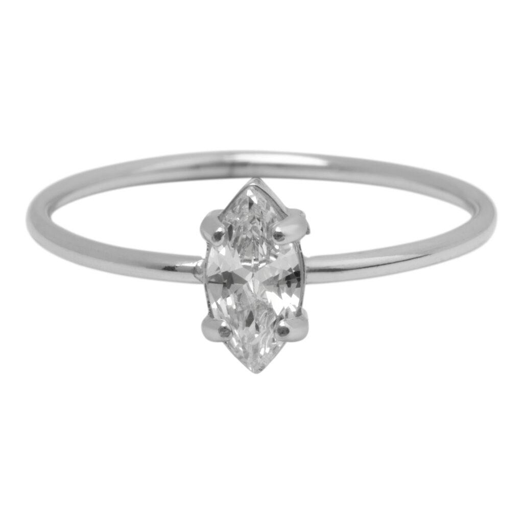 Deze ring is voorzien van een wit elipsvormig kristal dat zacht schittert in het licht. De vorm en kleur maken hem tot een veelzijdig sieraad voor elke gelegenheid.