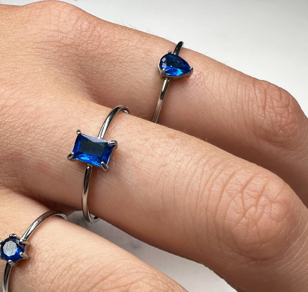 De donkerblauwe steen zorgt voor een chique en tijdloze uitstraling. Deze kleur vangt het licht op een bijzondere manier en combineert prachtig met zilver of denim.