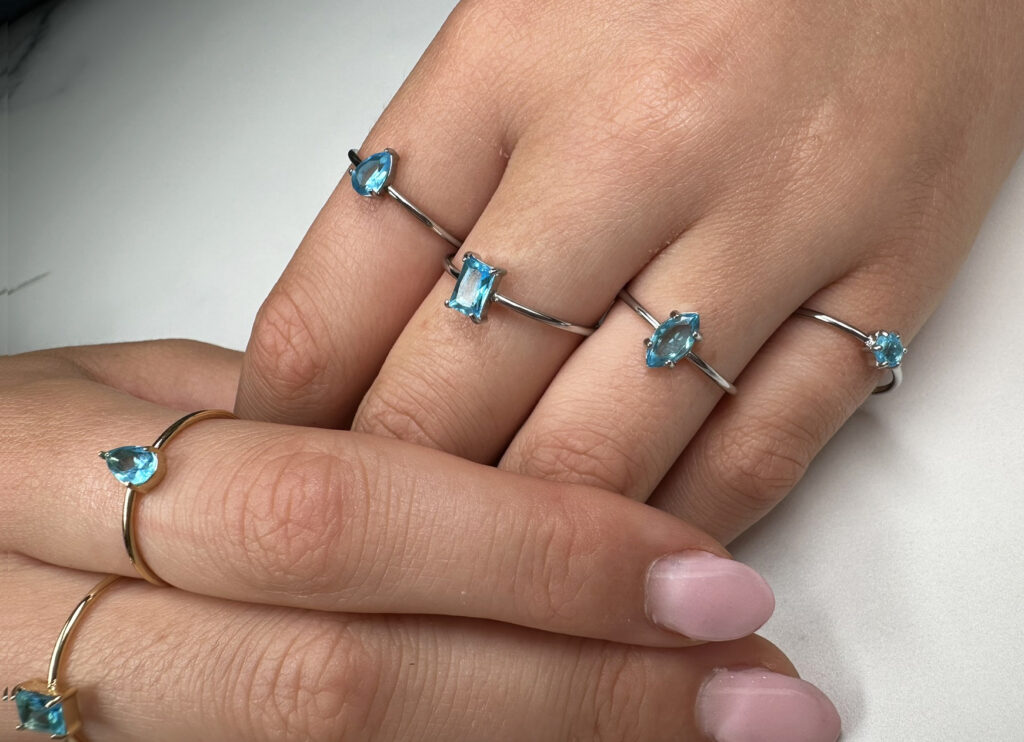 Stalen ring met helder lichtblauw kristal – fris en zomers.