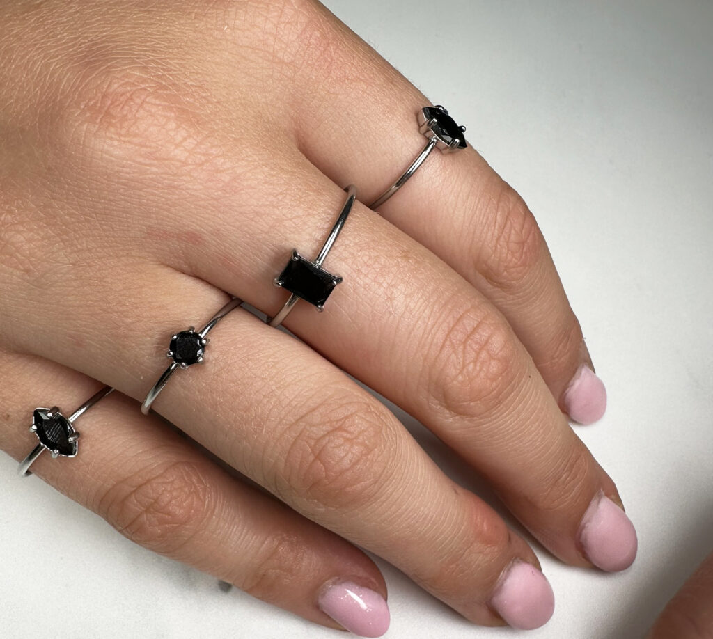 Zilverkleurige ring met zwart kristal – sterk contrast, sterke look.