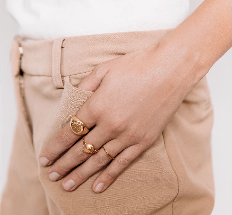 Een hele bijzondere ring speciaal voor jouw ontworpen; een minimalistische ring met daarin een beweegbaar element met een historische munt versiering. Gemaakt van 316L staal.