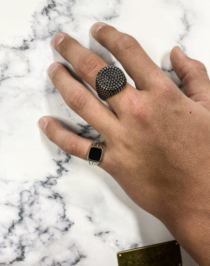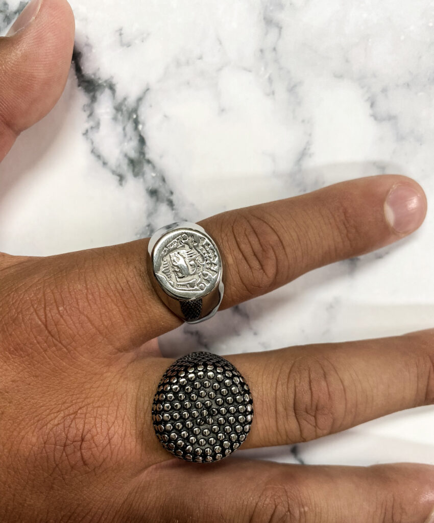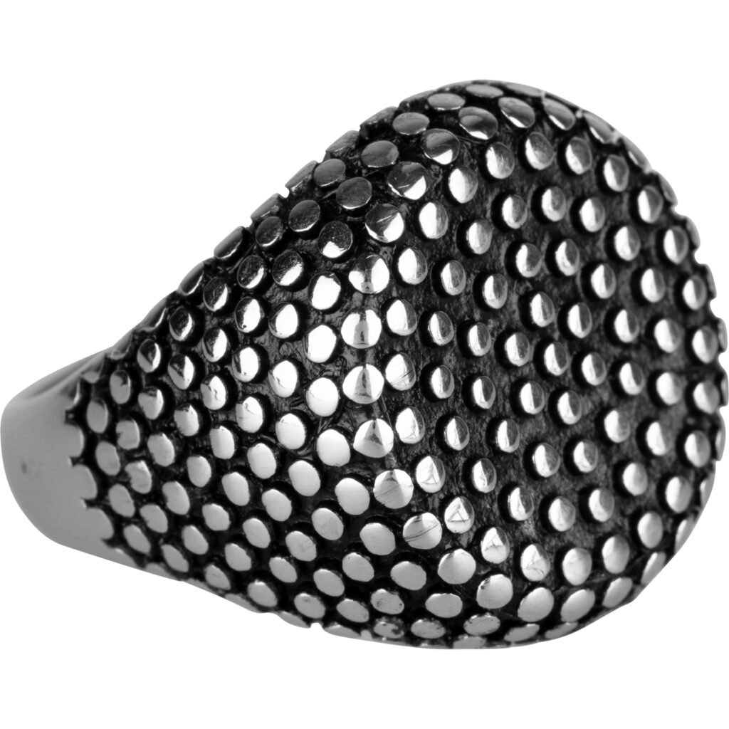 Stoere grote maat zegelring voor heren en dames “Charmin’s UNI Heren Zegelring Rond Bewerkt met Bolletjes Staal R971” van hét ringen merk Charmin’s.