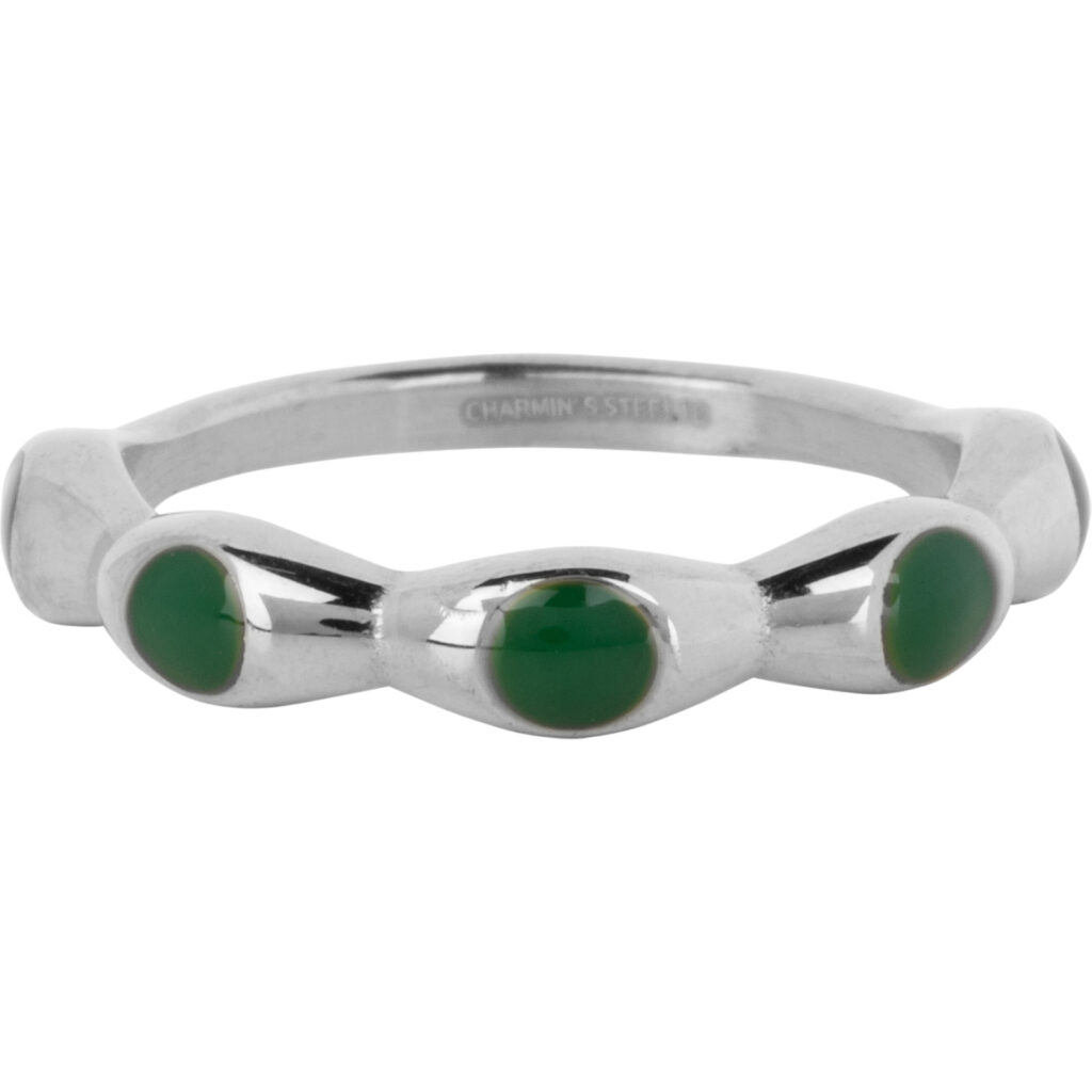 Stalen stapelring “Charmin’s Zilverkleurig Ring Met Donker Groene Ronde Emaille Bollen Staal R1497” van het fashion sieradenmerk Charmin’s.